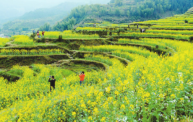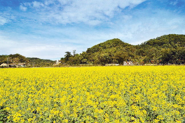 Situated in Pingshan Village, Dadong Town, Dapu County, Meizhou City, Qianmu Terrace (literally 1,000 mu, or 667,000 square meters of terrace) is full of canola flowers that sweep across the hills. Beholding the beautiful golden fields this time of the year is one of the better choices for weekend outings.