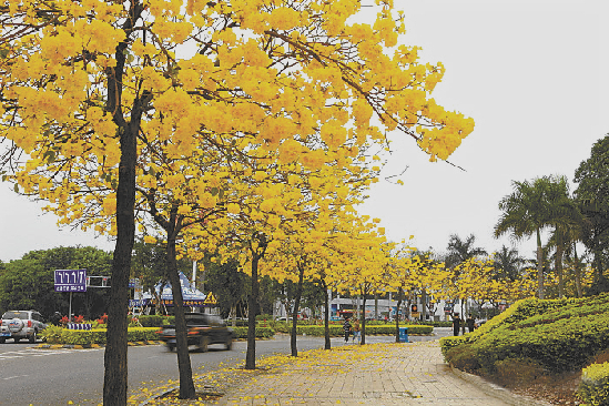 Recently in Foshan, it’s been easy for people to find and encounter bright golden patches of flowers in full bloom against the blue sky of the city. They are the blossoms of the golden trumpet tree. The tree is native to Brazil and considered by some to be among the most showy flowering trees on the planet thanks to its brilliant golden flowers.