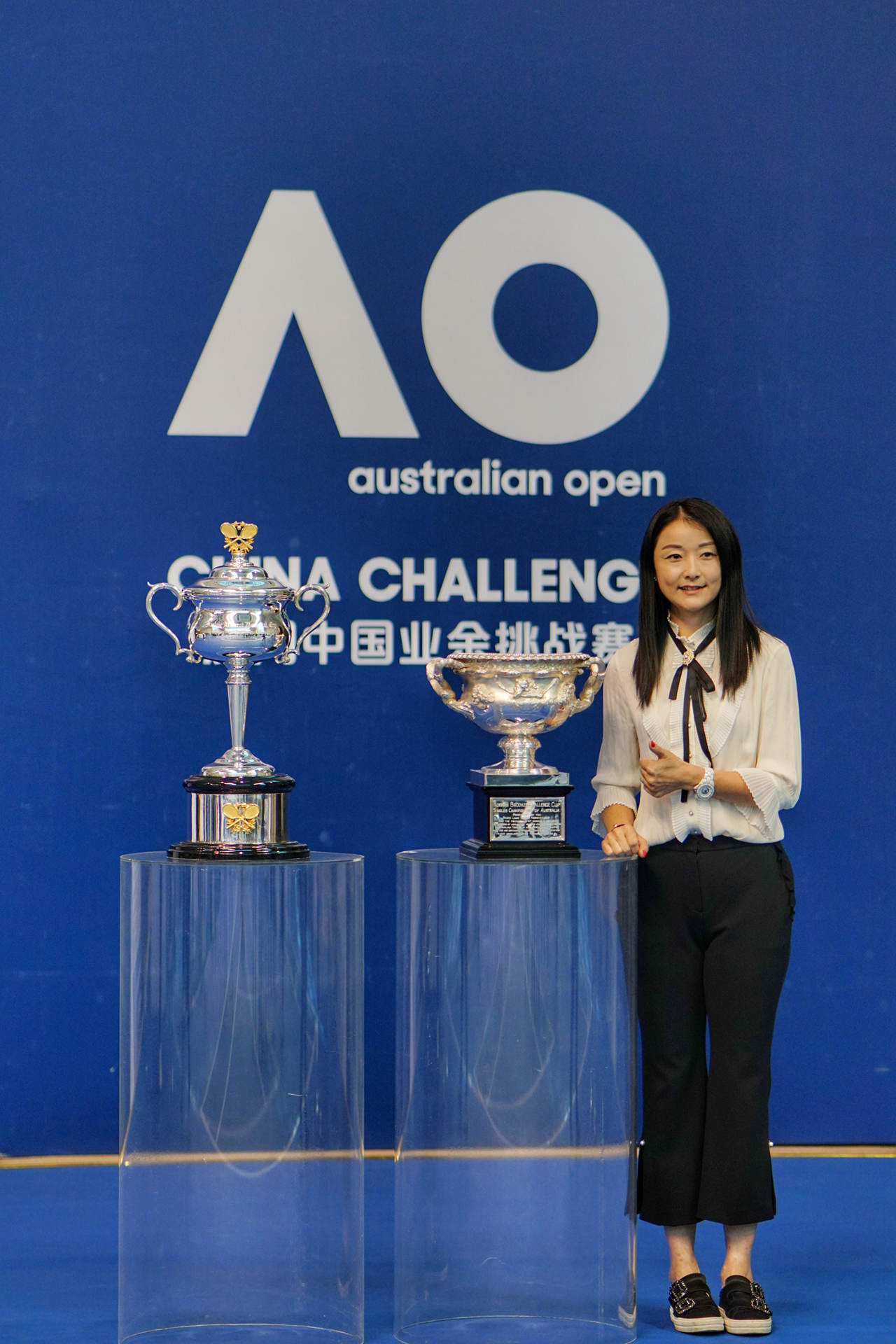 Yan Zi, a former title-winning doubles player of the Australian Open, poses for a photo with the Norman Brookes Challenge Cup (L) and the Daphne Akhurst Memorial Cup (R) of the tournament at the opening ceremony of the Shenzhen stop of the 2019 Australian Open China Challenge on Saturday. Photos by Wang Haolan