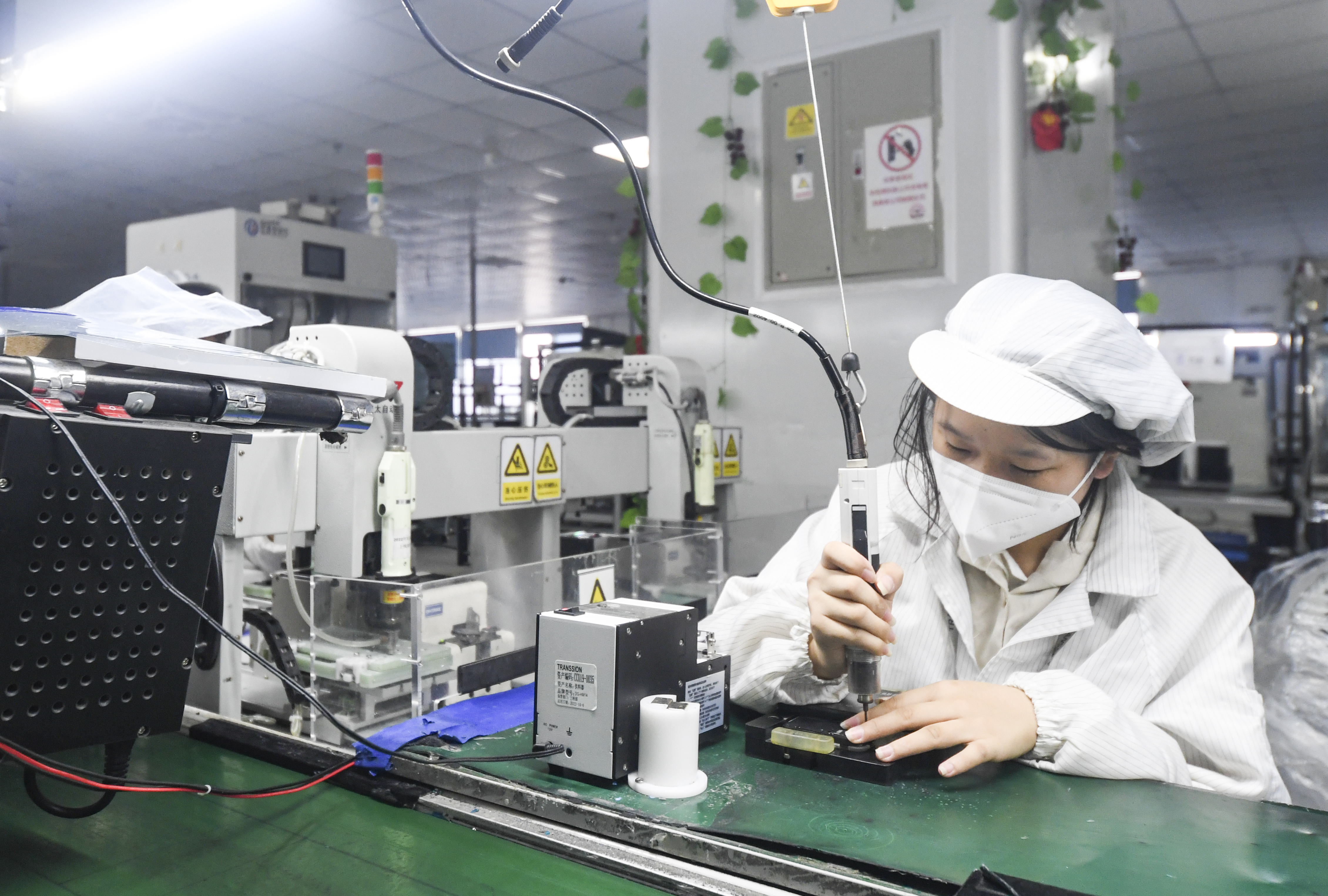 An employee works at Transsion's plant in Chongqing in this file photo. Xinhua