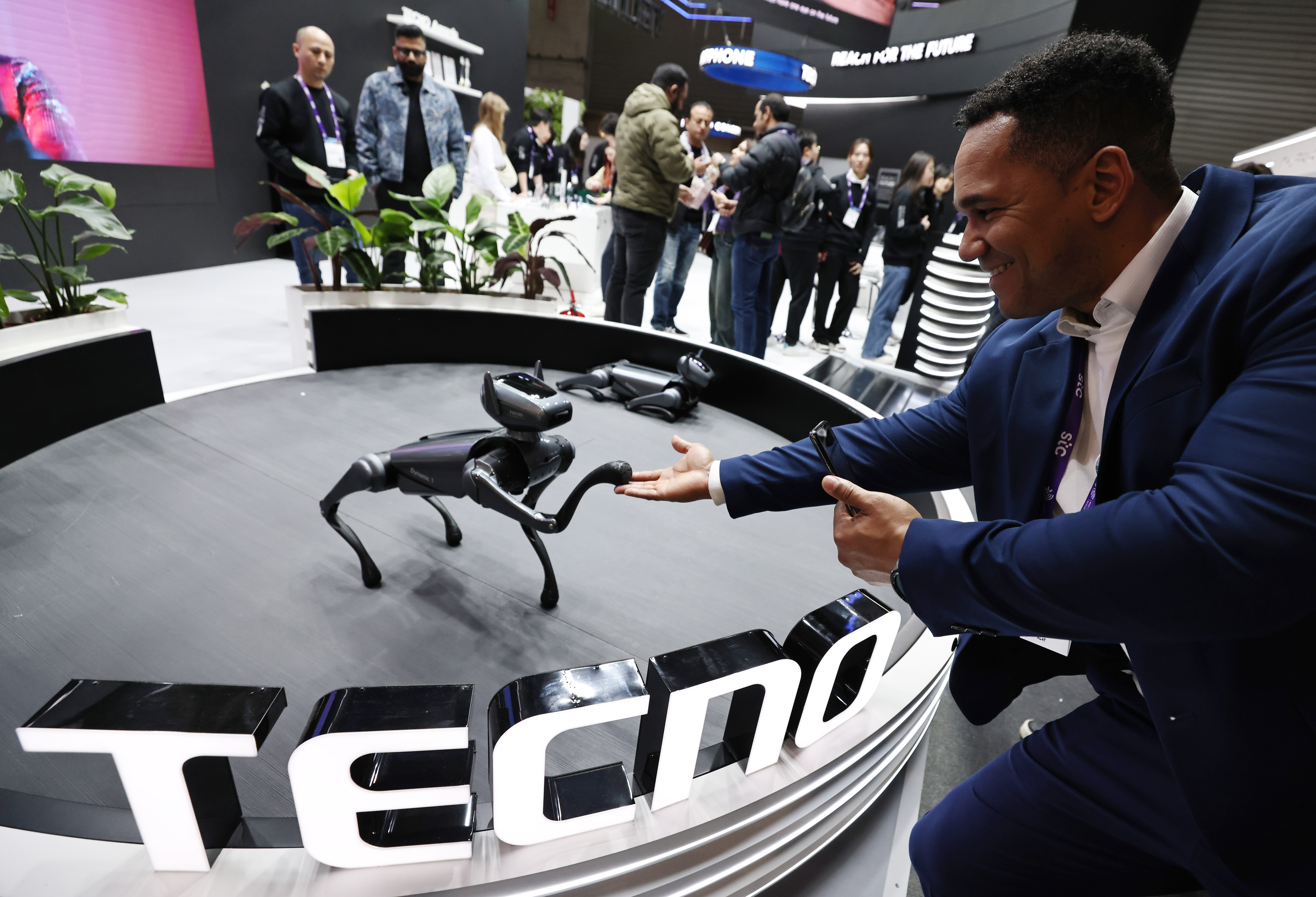 A visitor interacts with an AI-enhanced robotic dog that Transsion's TECNO sub-brand unveiled at this year's MWC in this Feb. 26 photo. Xinhua