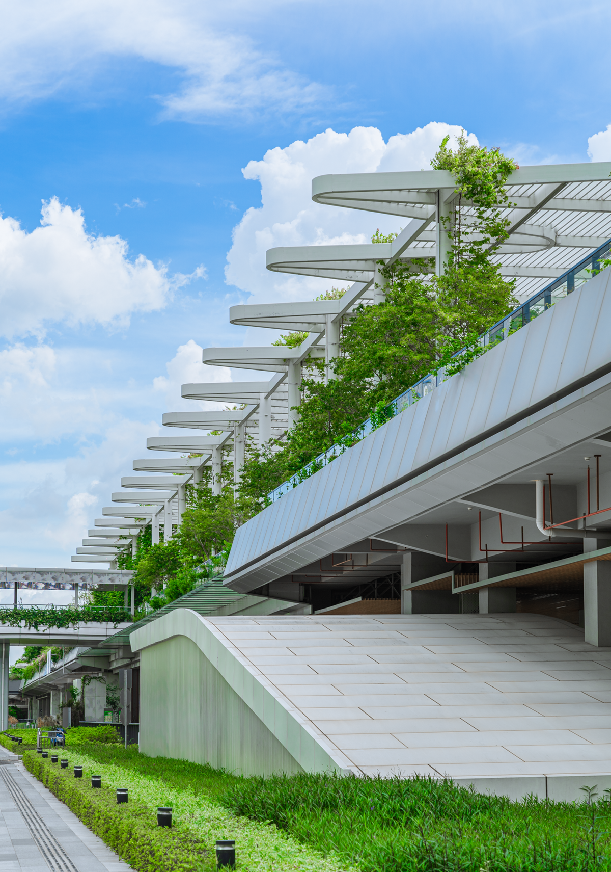 Unlike the high lines in New York and Paris that have been converted from an obsolete line, the Bao’an Exhibition High Line Park is a purpose-built elevated city spine, a green promenade stretching like a ribbon in the air above your head. From below, the park is spectacle. Look up and you’ll see blue sky, drifting clouds, and now and then an airplane slicing across the view so close that you can identify its logo.