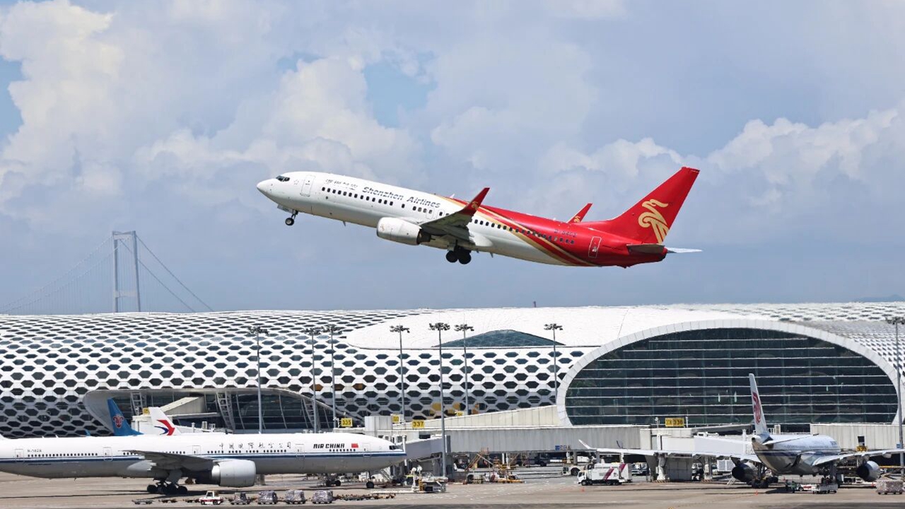 A Shenzhen Airlines plane takes off from Shenzhen Bao'an International Airport. Li Xudong