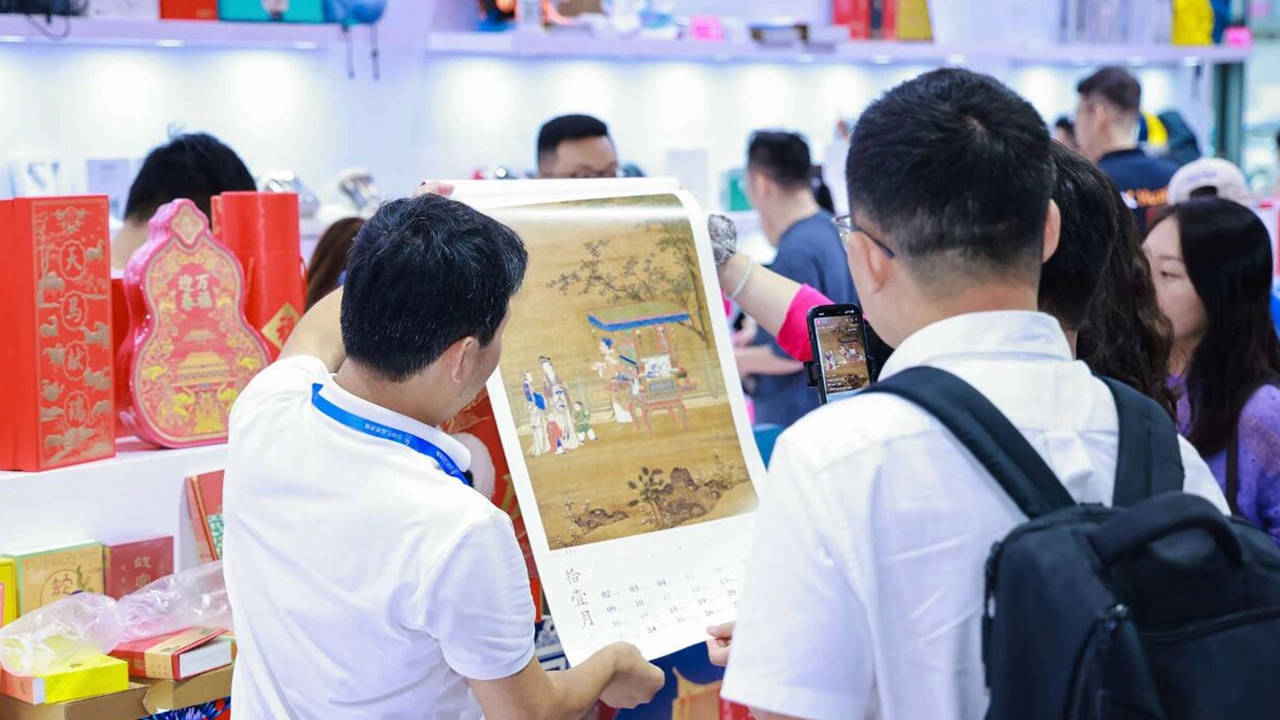 A vendor showcases a traditional-style wall calendar featuring classical Chinese artwork to interested buyers at the 33rd China (Shenzhen) International Gifts & Home Products Fair.