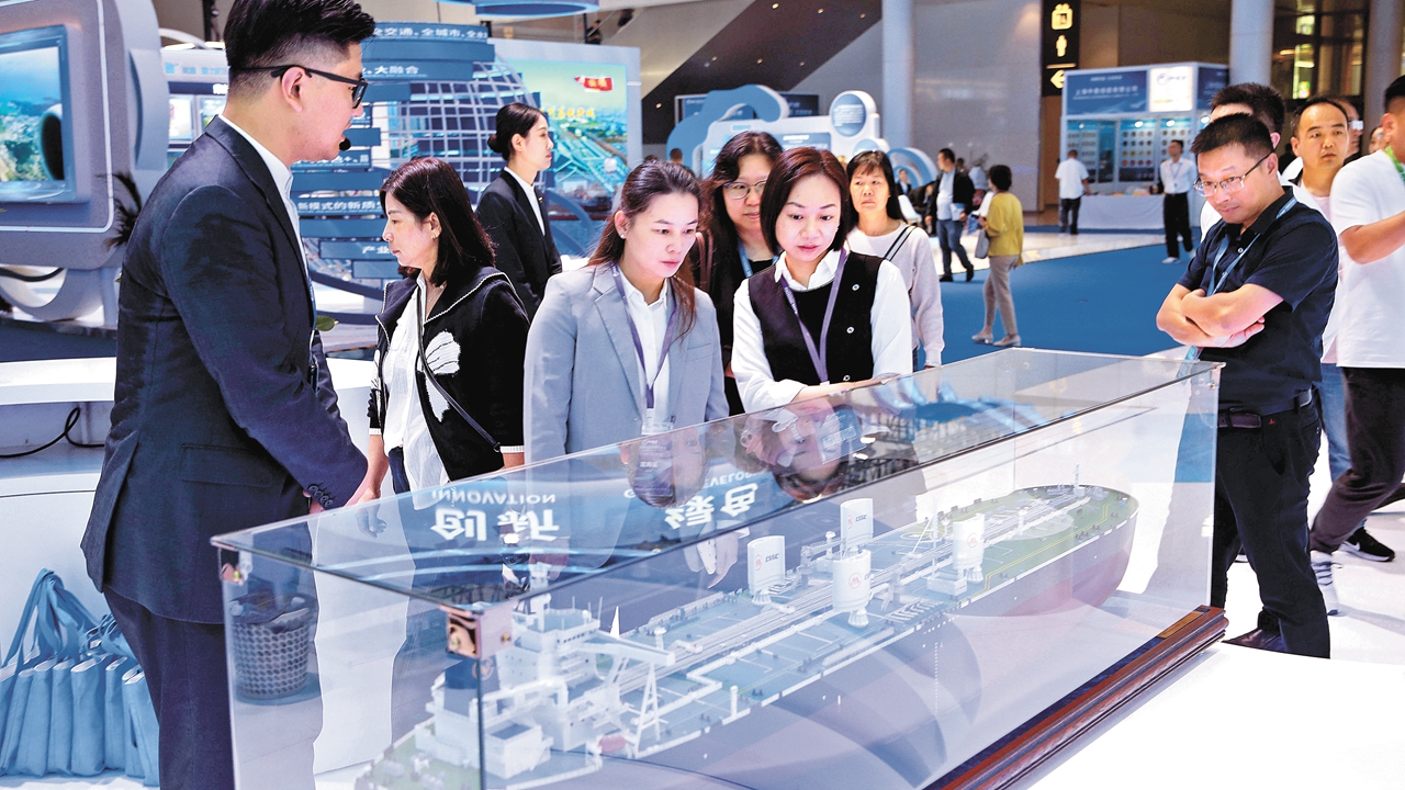Visitors gather around a ship model at China Merchants Group’s booth during the 2025 China Marine Economy Expo yesterday.