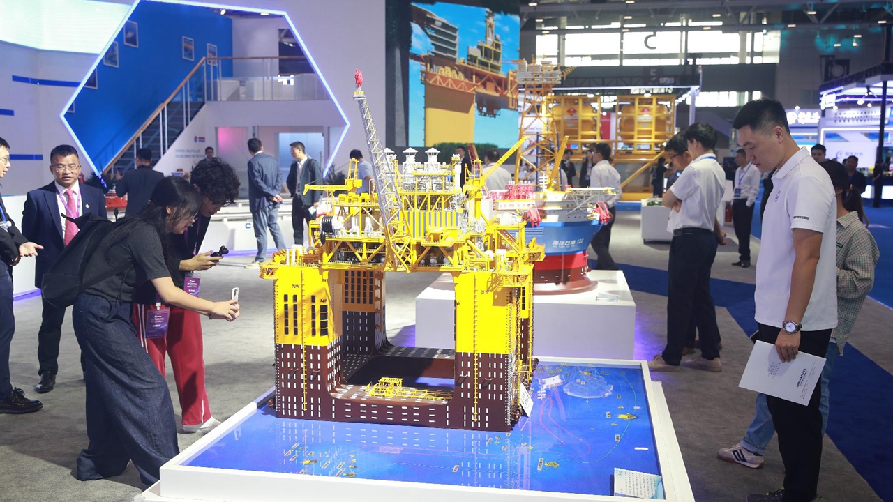 Visitors view a model of a new-generation deep-sea drilling platform at China National Offshore Oil Corp. booth.