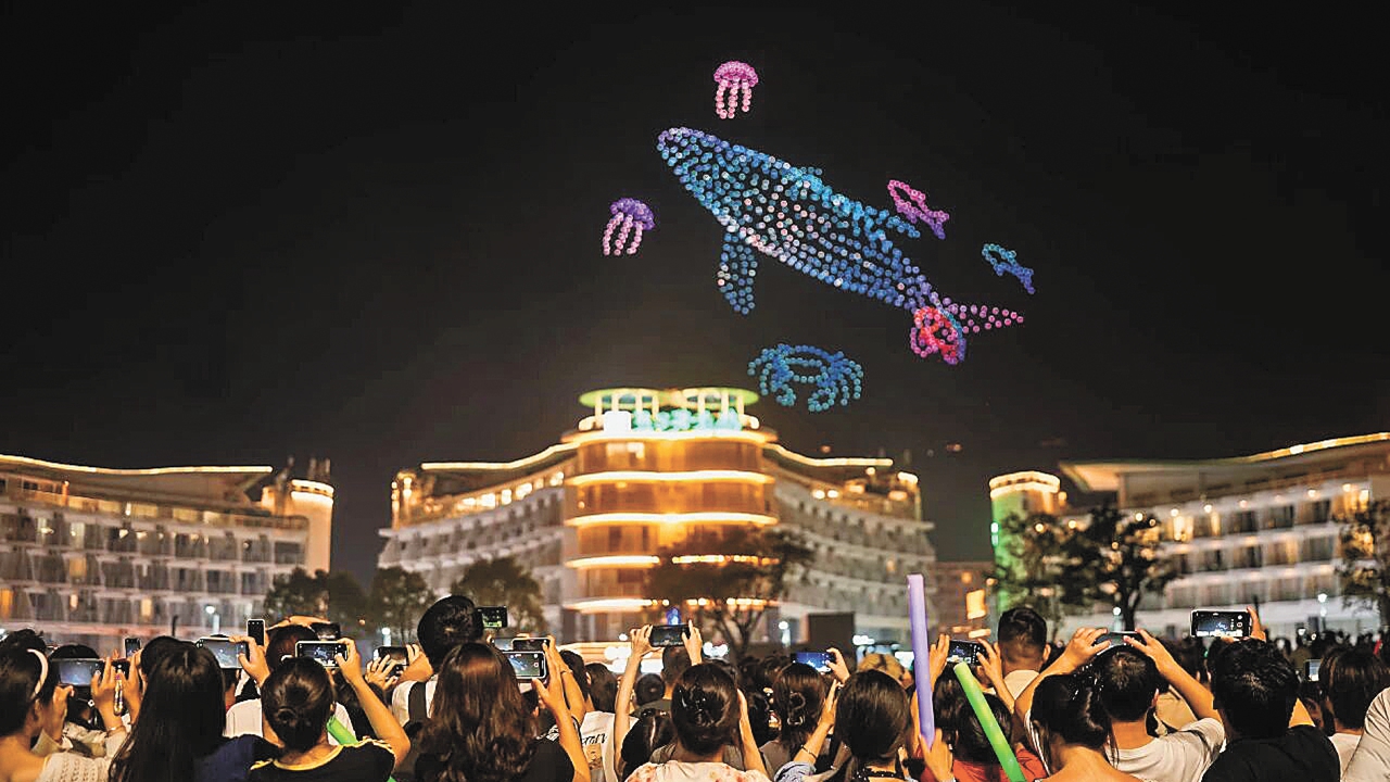 Spectators take photos during the drone light show in Dameisha on Oct. 11. File photo