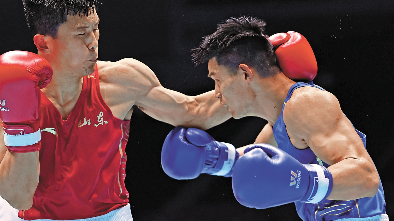 Boxers throw punches in the ring during the 15th National Games boxing finals at the Bao’an Sports Center in Bao’an District, Shenzhen, yesterday. Photos by Liu Xudong