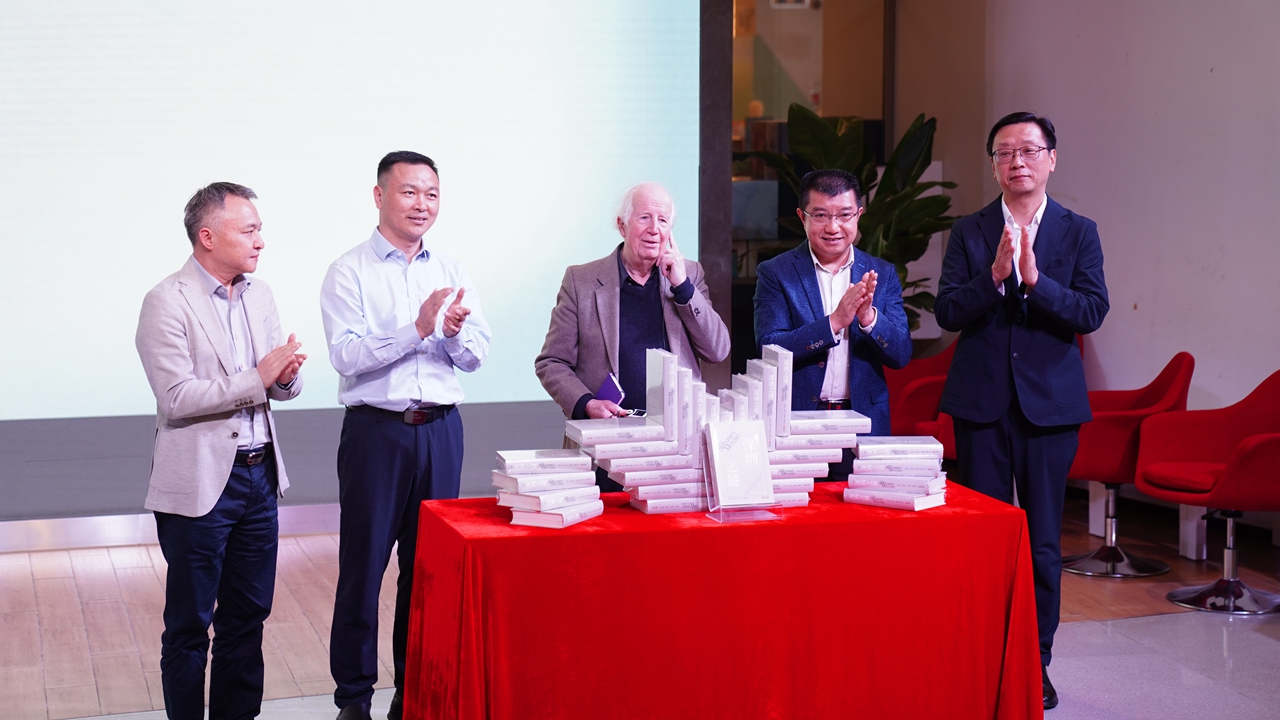 Alan Macfarlane (C) presents his book "The Shenzhen Mystery" during the launch event Monday.