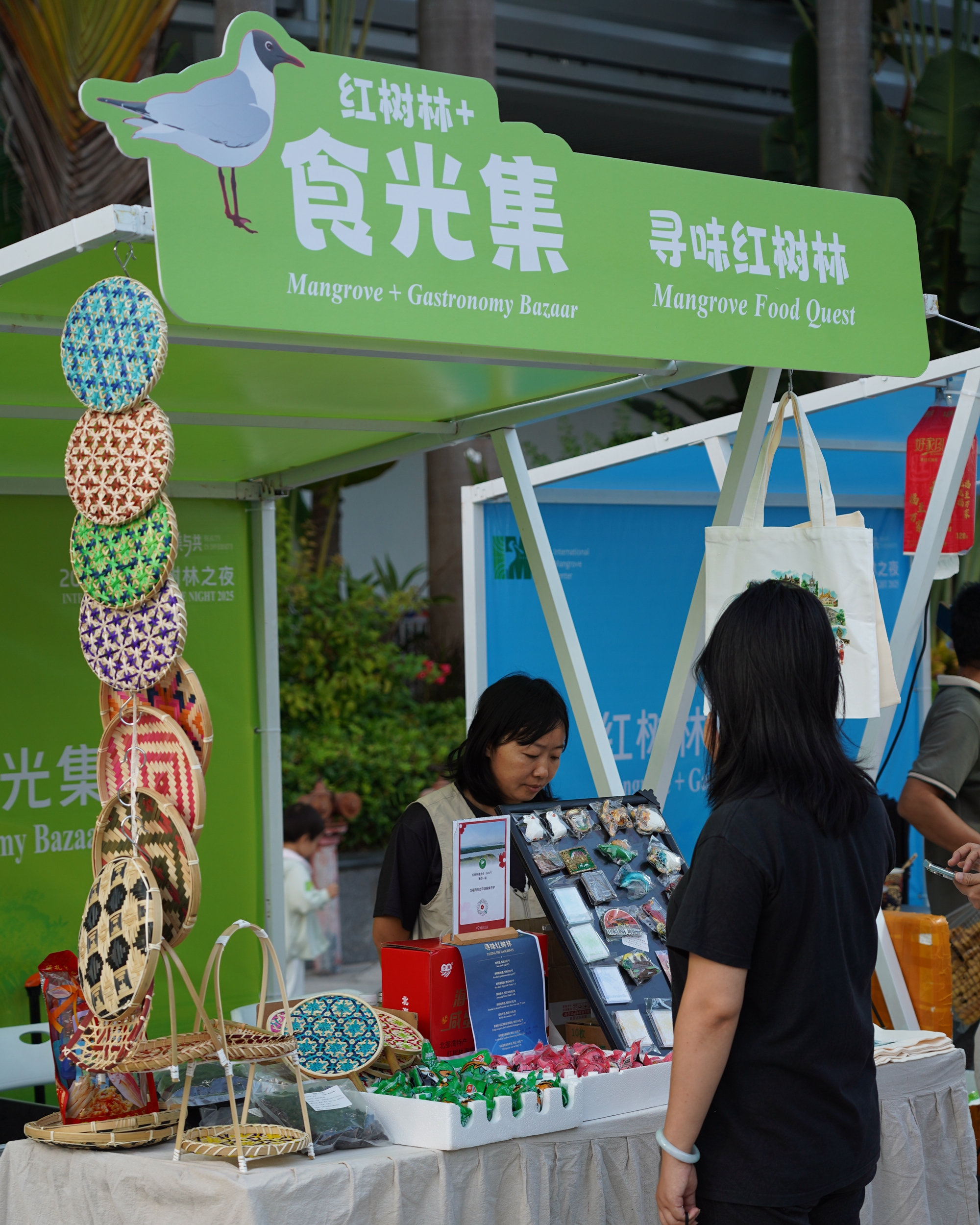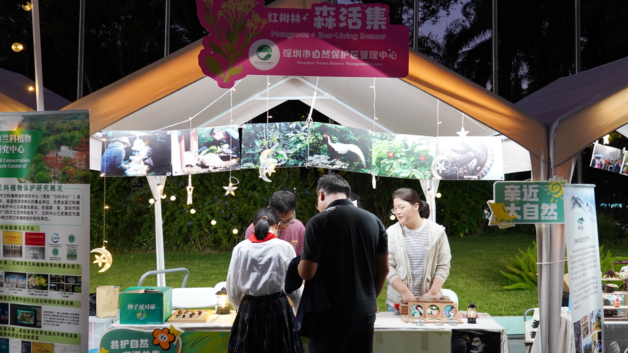 Shenzhen University Ph.D. candidates Verónica González (L in the back row) from Panama and Frank Sesu (R in the back row) from Ghana browse eco-creative products at an eco-living bazaar during the 2025 International Mangrove Night, which began yesterday at the Shenzhen International Garden and Flower Expo Park. Photos by Lin Songtao