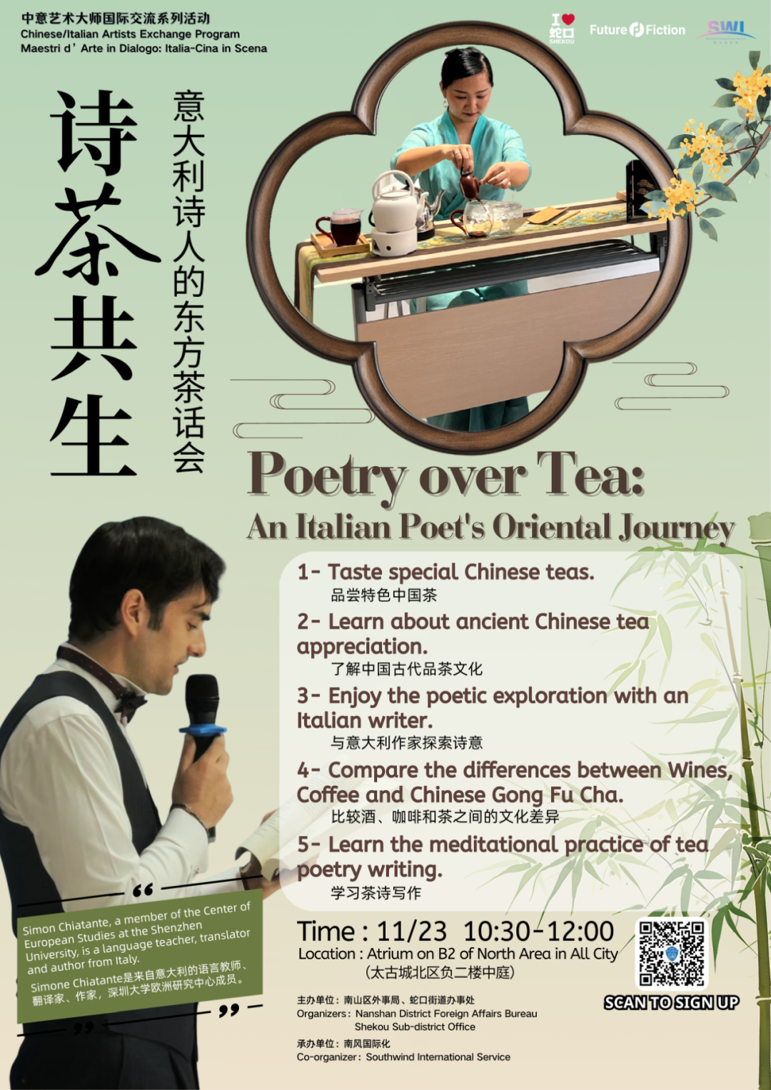 Simon Chiatante, an Italian poet based in Shenzhen, will present his new illustrated volume "Respiro" and explore links between poetry, Chinese tea ceremony, and Zen, with readings in Chinese, English, and Italian.