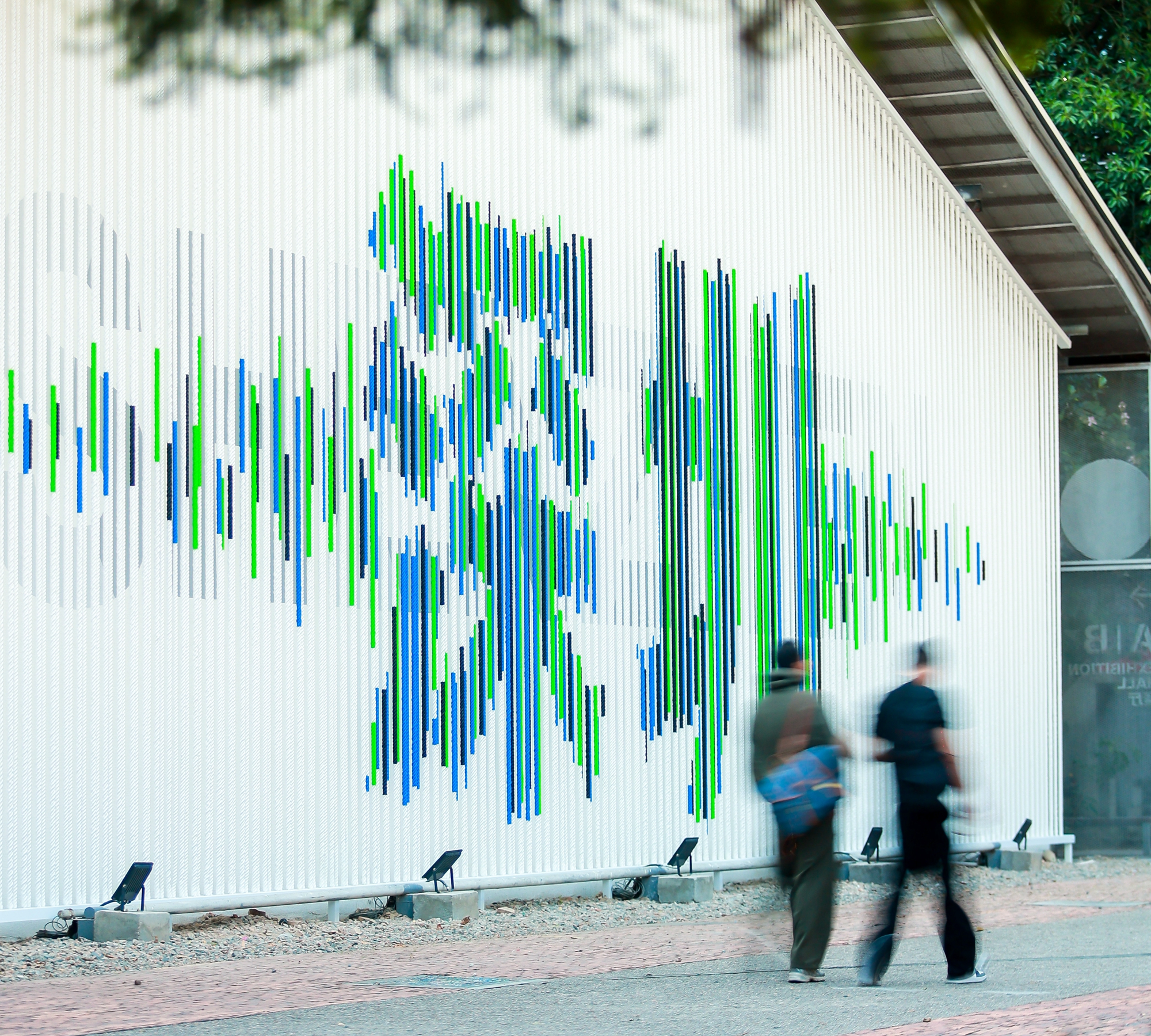 Previously the wall displayed the Chinese characters “深圳” alongside the English word “Shenzhen” in pixel-art style. This time, multiple ropes printed with the Chinese characters hang in front of a wall printed with the English word, creating a layered, overlapping effect. As viewers walk past the wall, changing perspectives produce a subtle sense of dynamic interplay.