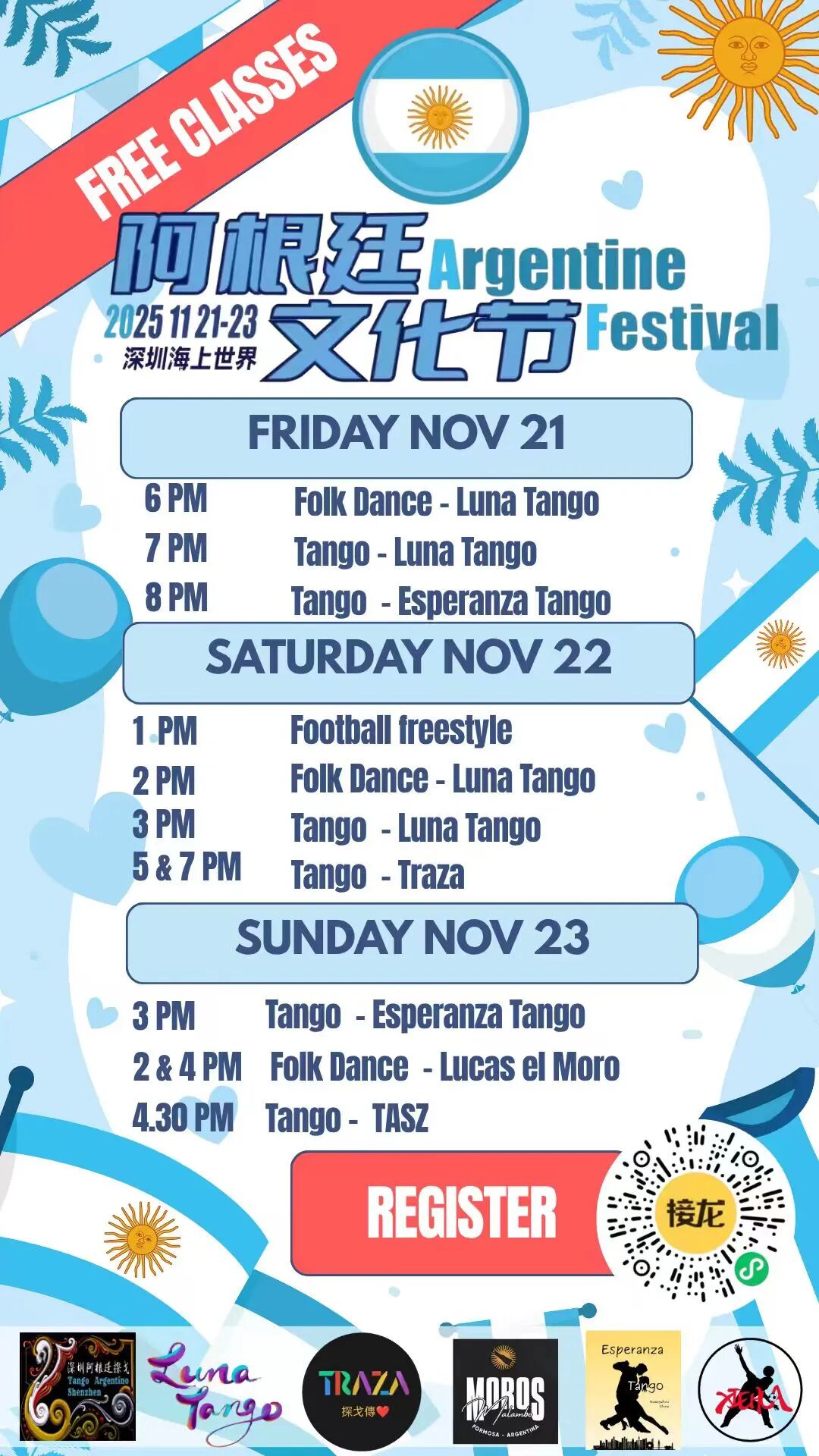 The event will also highlight Argentina’s iconic dance — the tango. Four schools from the region — Esperanza Tango School from Guangzhou, along with Shenzhen’s Luna Tango Club, Tango Argentino Shenzhen, and Tango Traza — will provide free beginner lessons throughout the weekend.