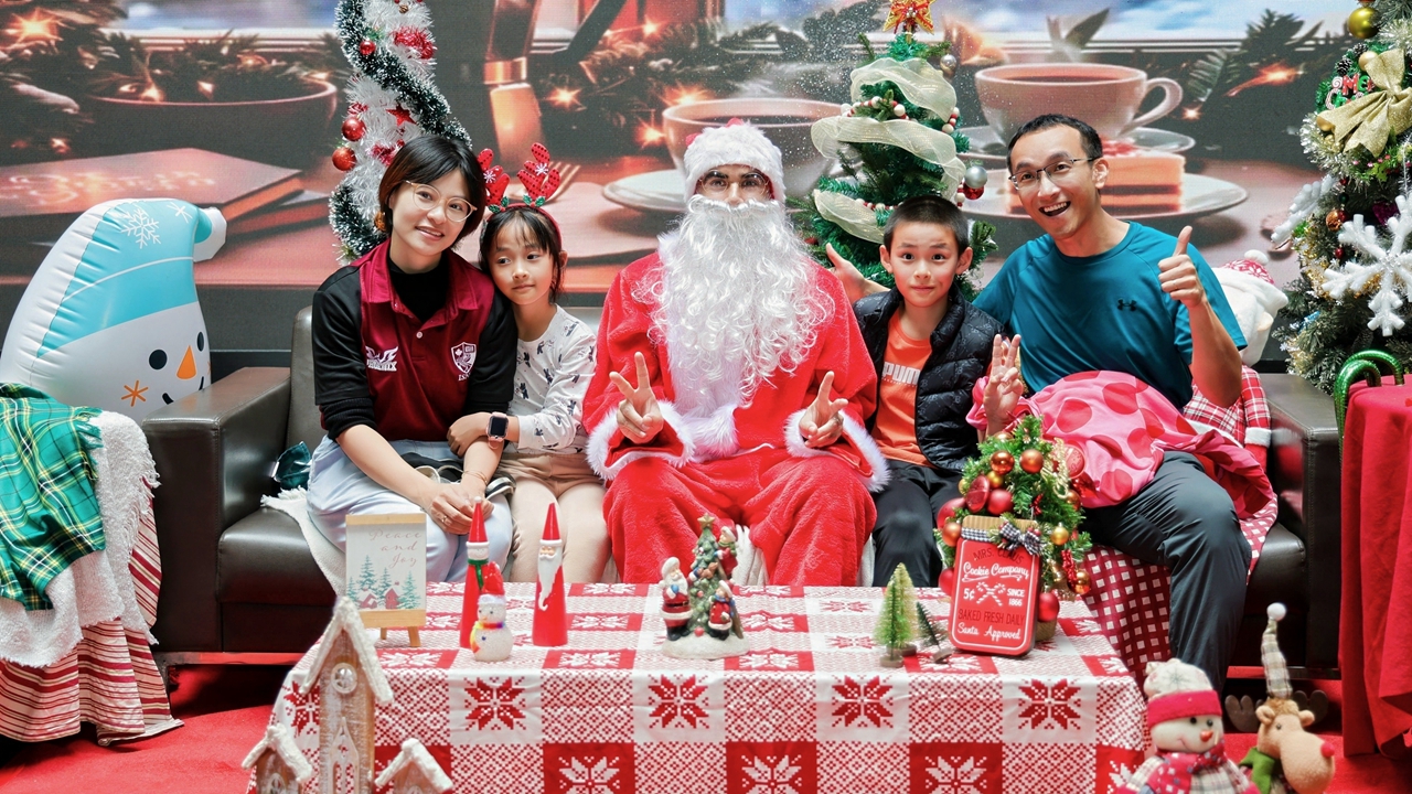 A family shares a joyful moment with Santa Claus during the Winter Magic Charity Carnival 2025 at ISNS on Sunday.