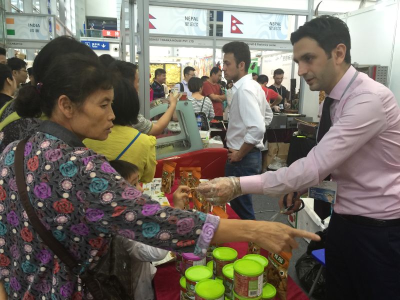 Yarim is not disappointed this year, as hundreds of rolls have been sold in the past days. Exceptionally long queues form at noon and both Chinese and foreigners are fans of Yarim’s offerings. This year’s One Belt and One Road Hall is more like an international bazaar, with exhibitors from 35 countries and regions along the Belt and Road Initiative hawking their jewelry, ornaments, snacks, or wines. Yarim’s booth was the only one that offered food made on the spot.
