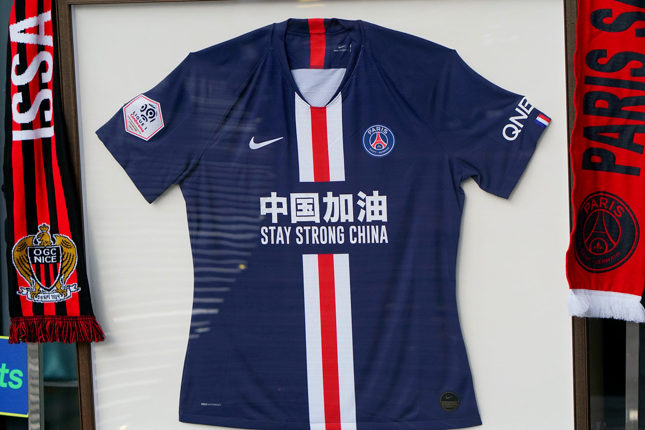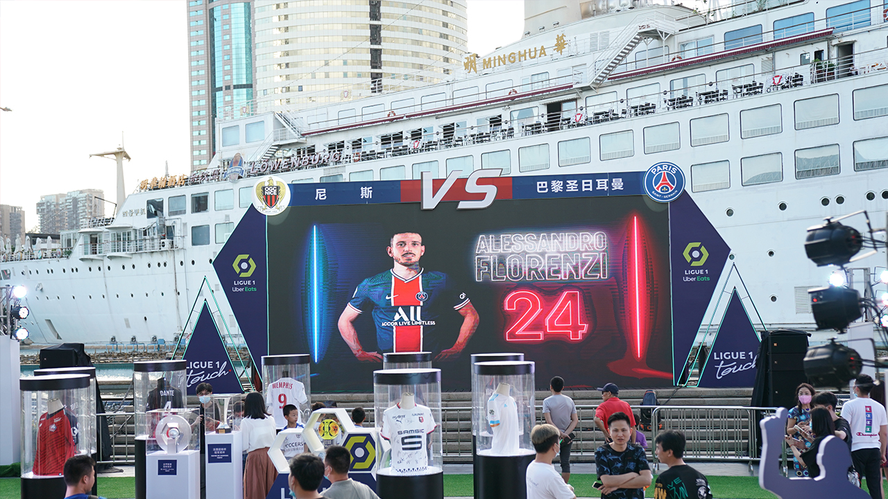 A large screen showing introduction of French football league Ligue 1 and video messages sent by Ligue 1 players attracted many residents to stop by and take an interest in the signed jerseys and football kits on display on the square in front of the Ming Hua liner at the Sea World in Shekou, Nanshan District.