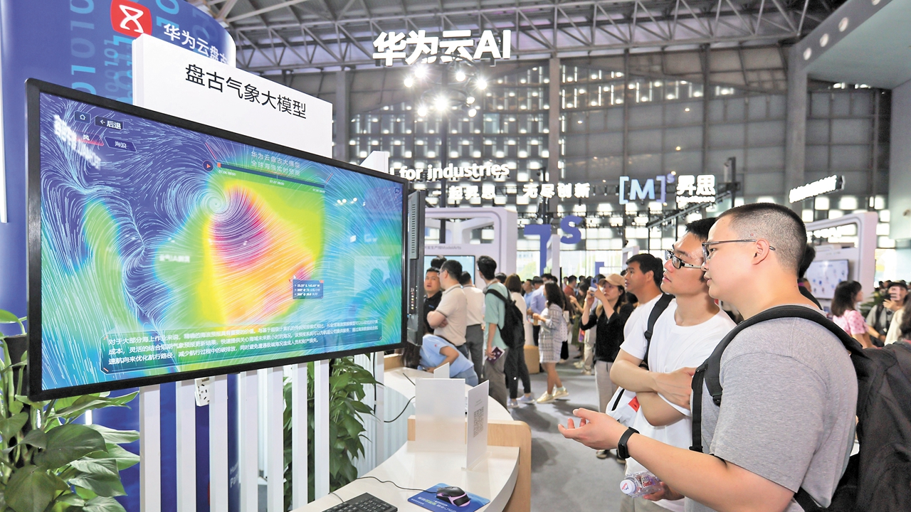 The Pangu weather AI model created by Huawei Technologies Co. is showcased at the World Artificial Intelligence Conference 2023 in Shanghai on Thursday. Huawei unveiled its AI model upgrade Pangu 3.0. in Dongguan on Friday. Xinhua