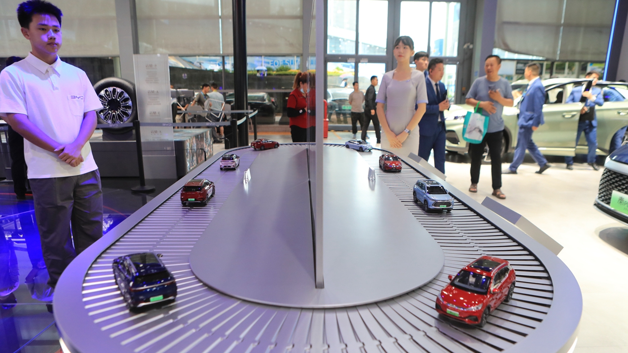 NEV models are on display at the BYD booth during the Guangdong-Hong Kong-Macao Greater Bay Area International Auto Show at Shenzhen Convention and Exhibition Center in Futian District in June. Sun Yuchen