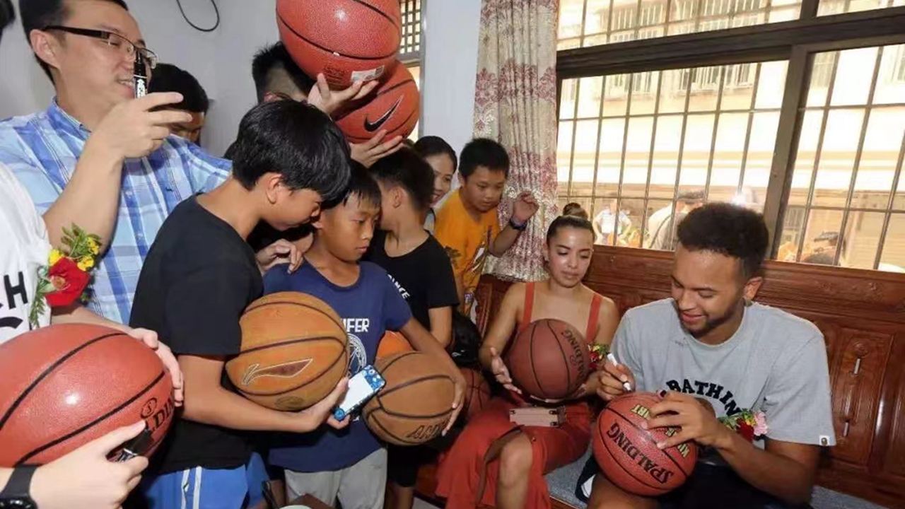 Anderson signs on basketballs for kids in Xinmu New Village in Longgang District in 2018.
