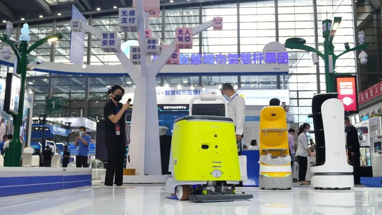 A visitor takes an interest in a floor-sweeping machine in the smart city exhibition hall of last year's China Hi-Tech Fair in Futian.