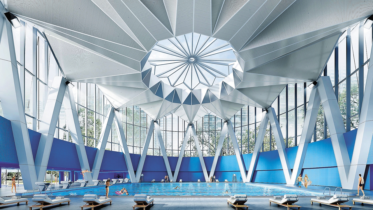 A computer-generated image of a swimming hall.
