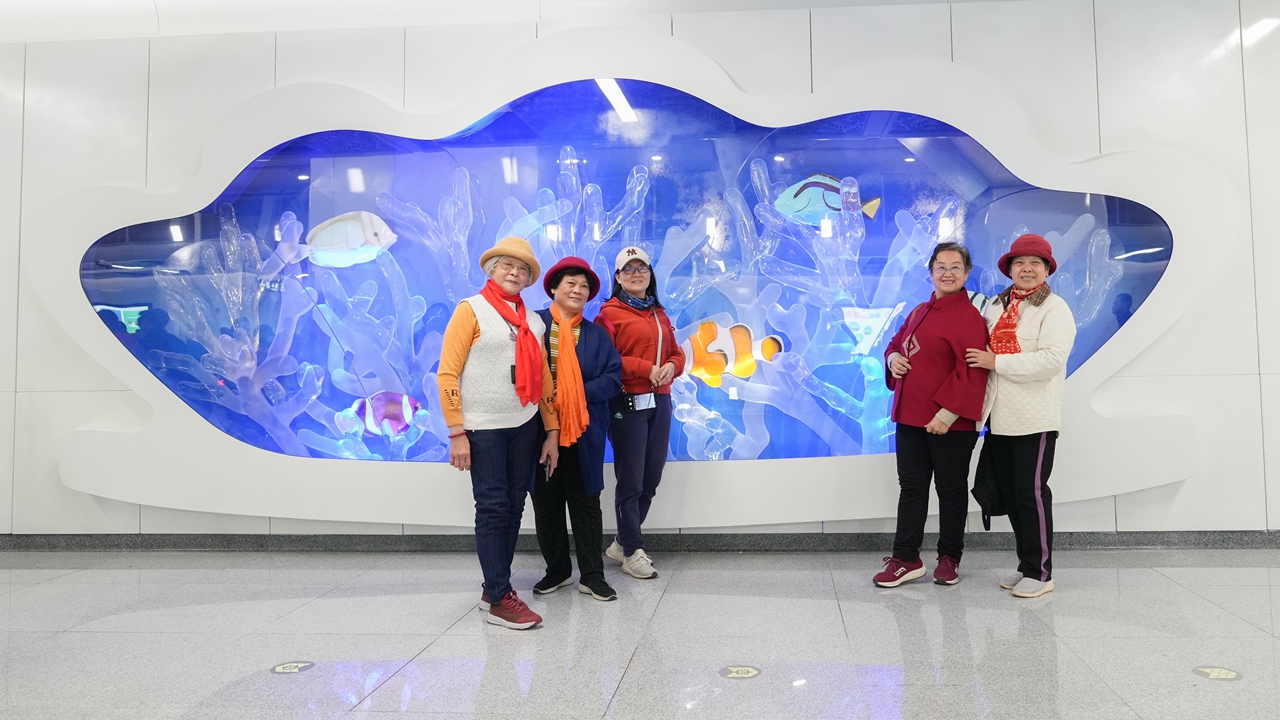 Passengers pose for a photo with an ocean-themed decoration in Dameisha Station. Liu Xudong