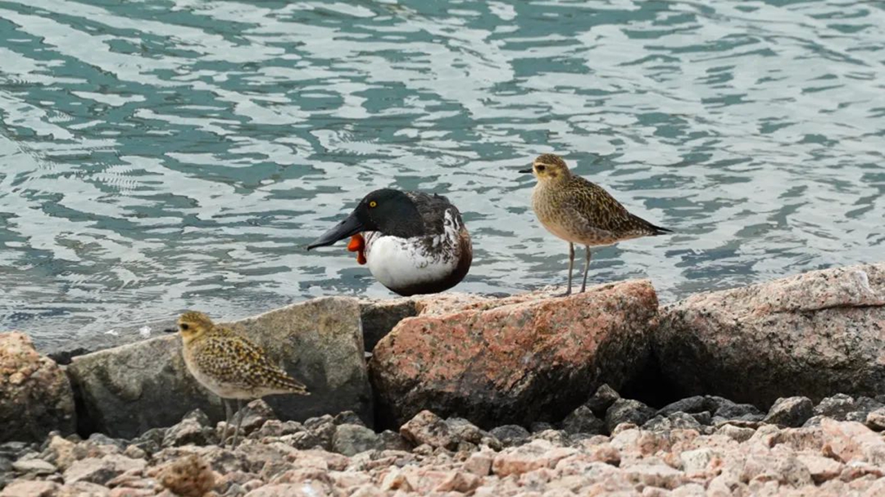 A male northern shoveler and two Pacific golden plovers are seen taking a rest at Shenzhen Talent Park in Nanshan District on Dec. 9. Wang Haolan