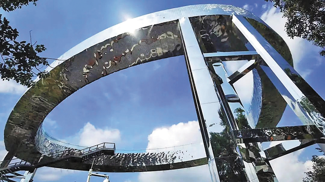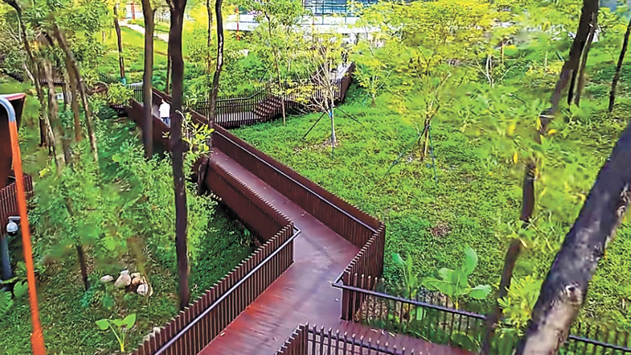 A striking elevated shield-shaped walkway at Dalinggu Park. Photo from WeChat account "longgangfabu"