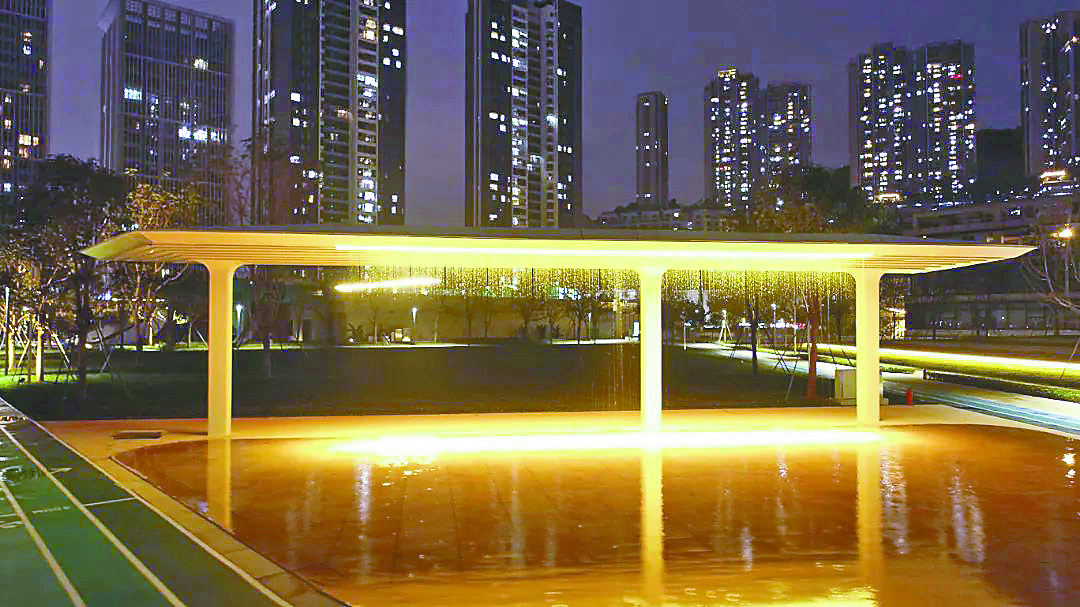 An illuminated shade structure with cascading water at Yueqing Park. Photo from WeChat account "longgangfabu"