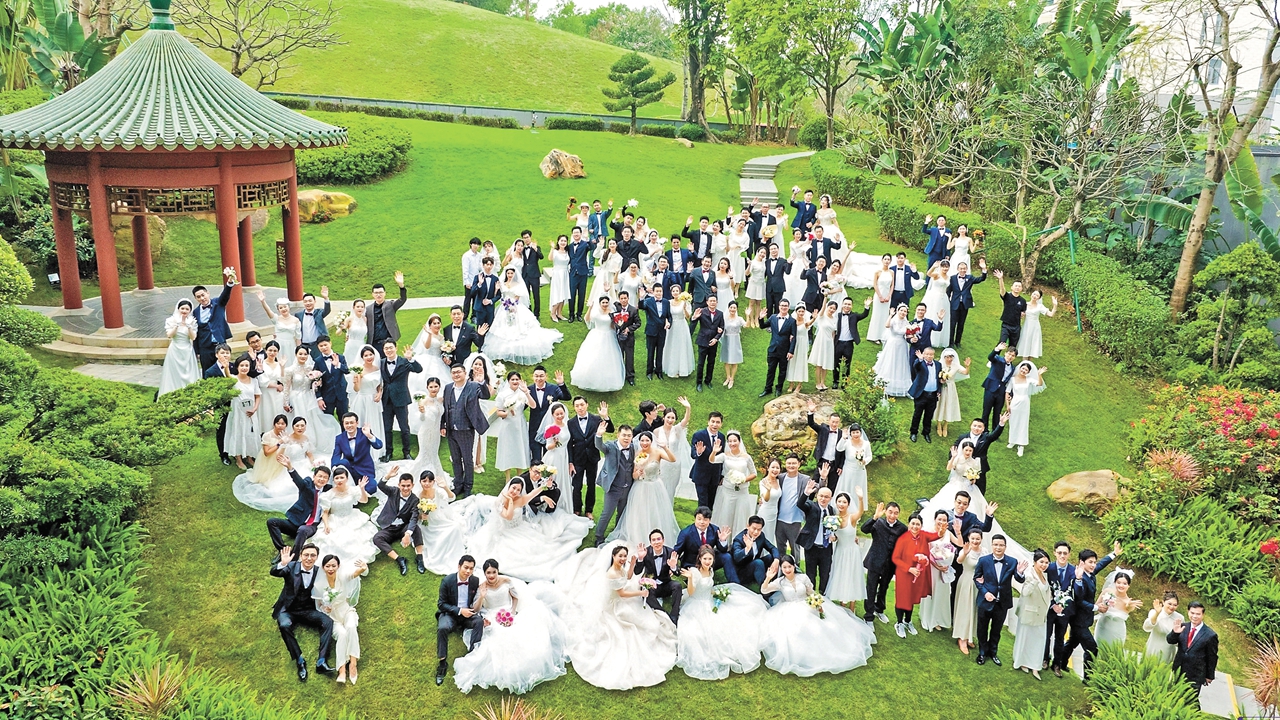 Couples are seen during a mass wedding ceremony at the Chinese University of Hong Kong, Shenzhen (CUHK-Shenzhen) on Saturday. In celebration of the 10th anniversary of the university, CUHK-Shenzhen organized the special wedding ceremony for 100 couples to celebrate the fruitful love that has blossomed over the past decade among those connected to the university. The participants in the ceremony included not only newlywed couples, but also those celebrating wedding anniversaries. Attendees included students, alumni, and faculty members. Shenzhen Special Zone Daily