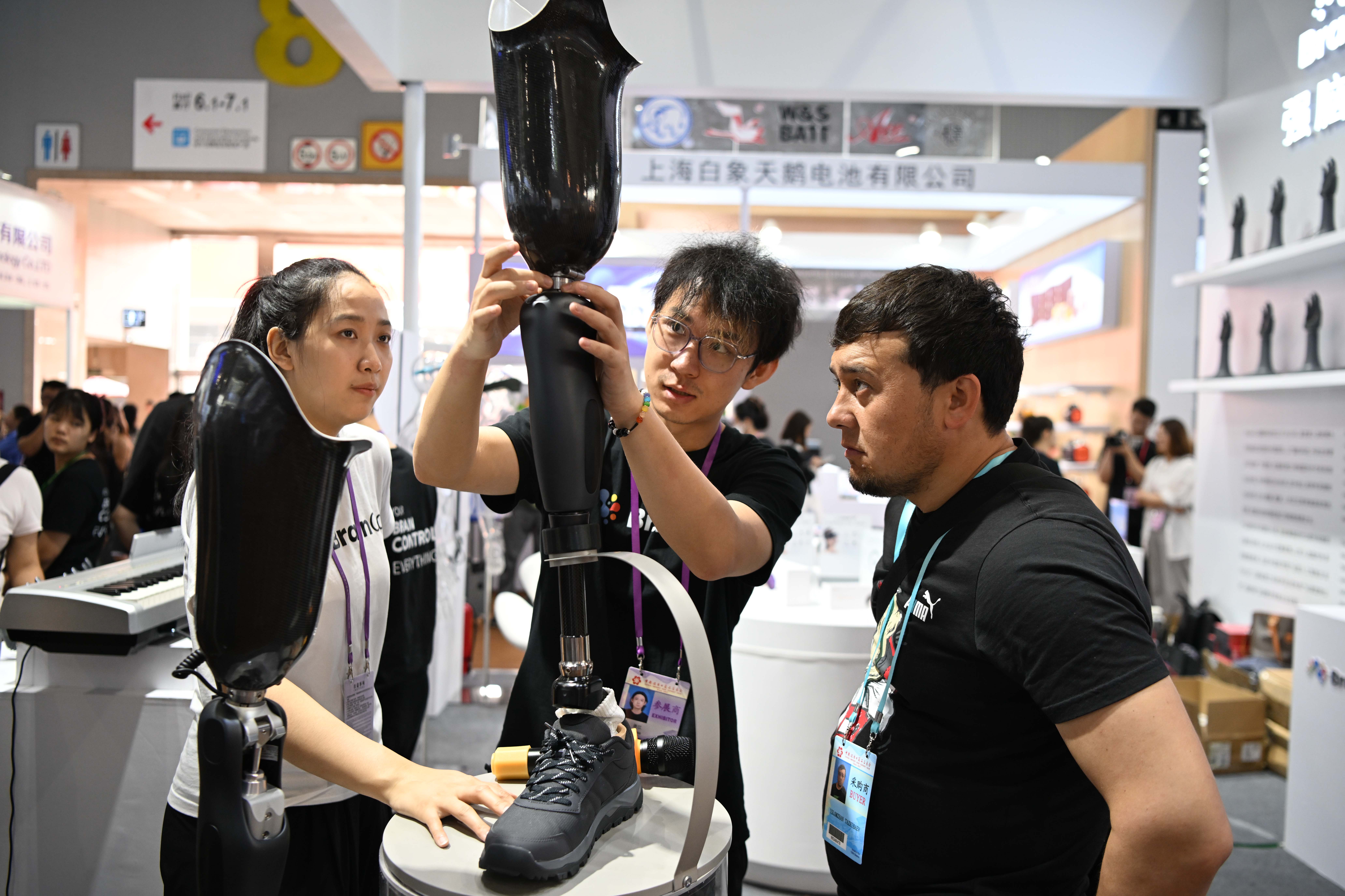 Exhibitors demonstrate the bionic leg to a potential buyer at the Canton Fair in this April 17 photo. Xinhua