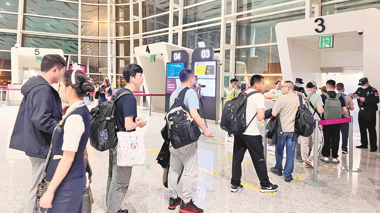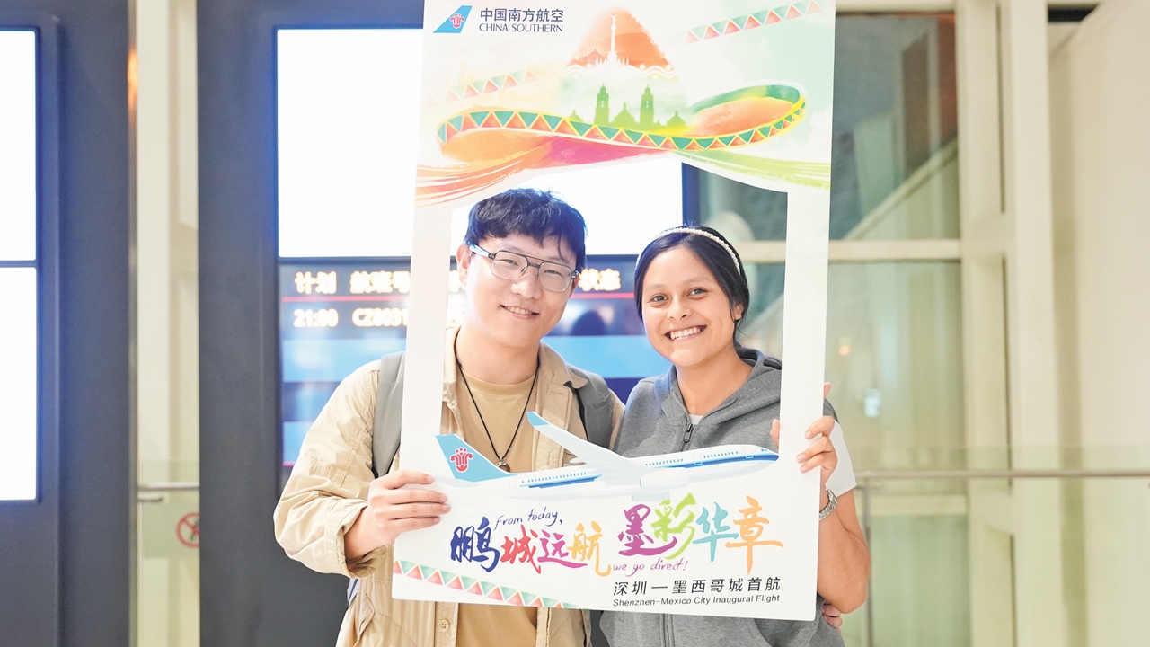 Passengers pose for a photo before boarding the inaugural direct flight from Shenzhen to Mexico City at the Shenzhen Bao’an International Airport on Saturday. The flight, operated by China Southern Airlines, is the longest nonstop regular commercial flight to originate in China, covering an intercontinental distance of 14,147 kilometers. Photos courtesy of China Southern Airlines