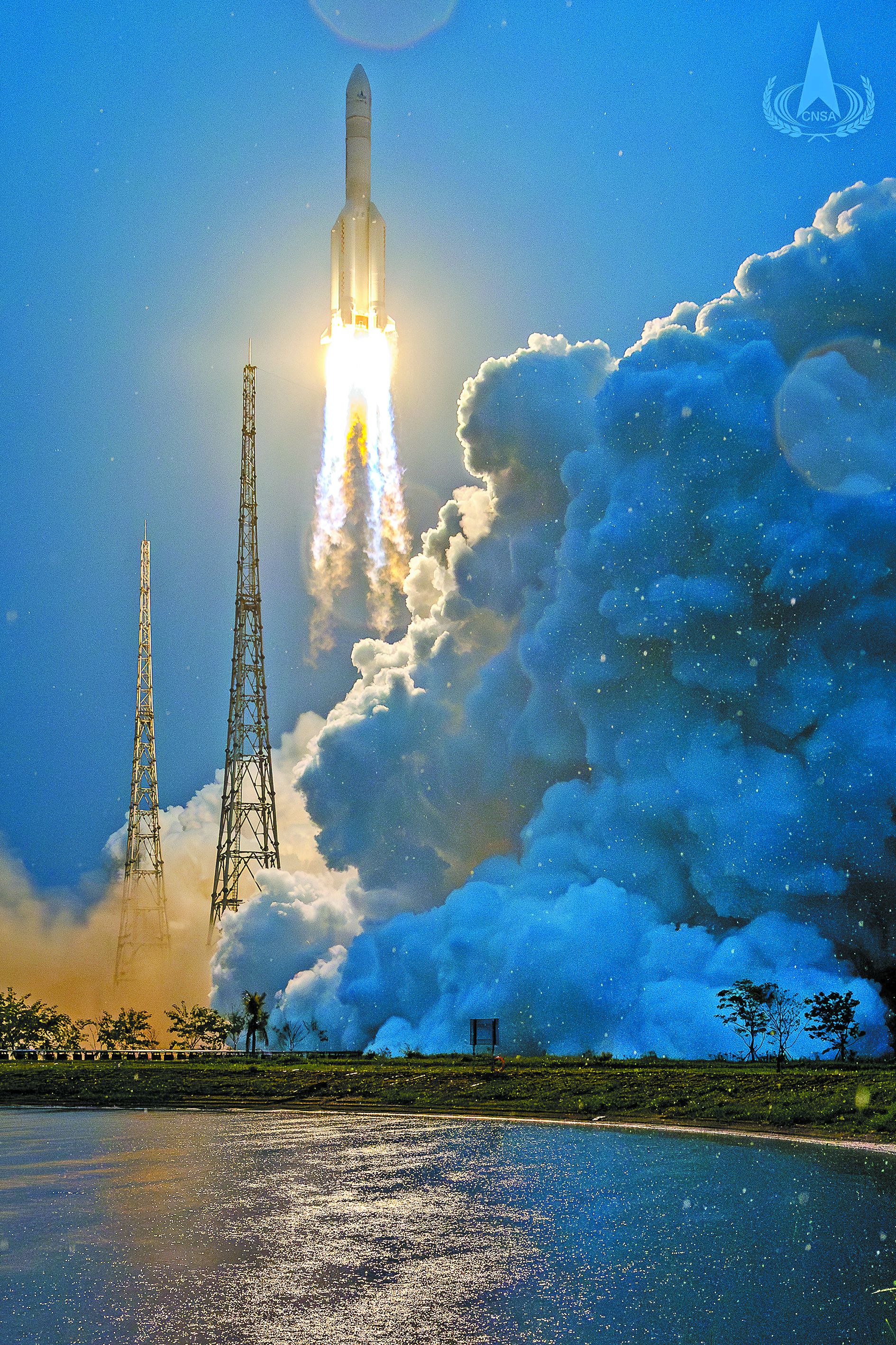 The Chang’e-6 probe is being lifted by the Long March 5 heavy-lift carrier rocket into the space in this May 3 file photo.