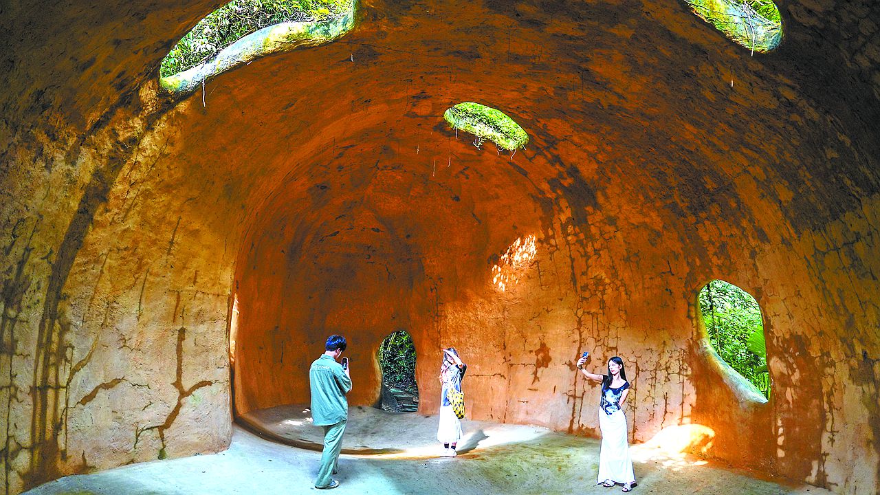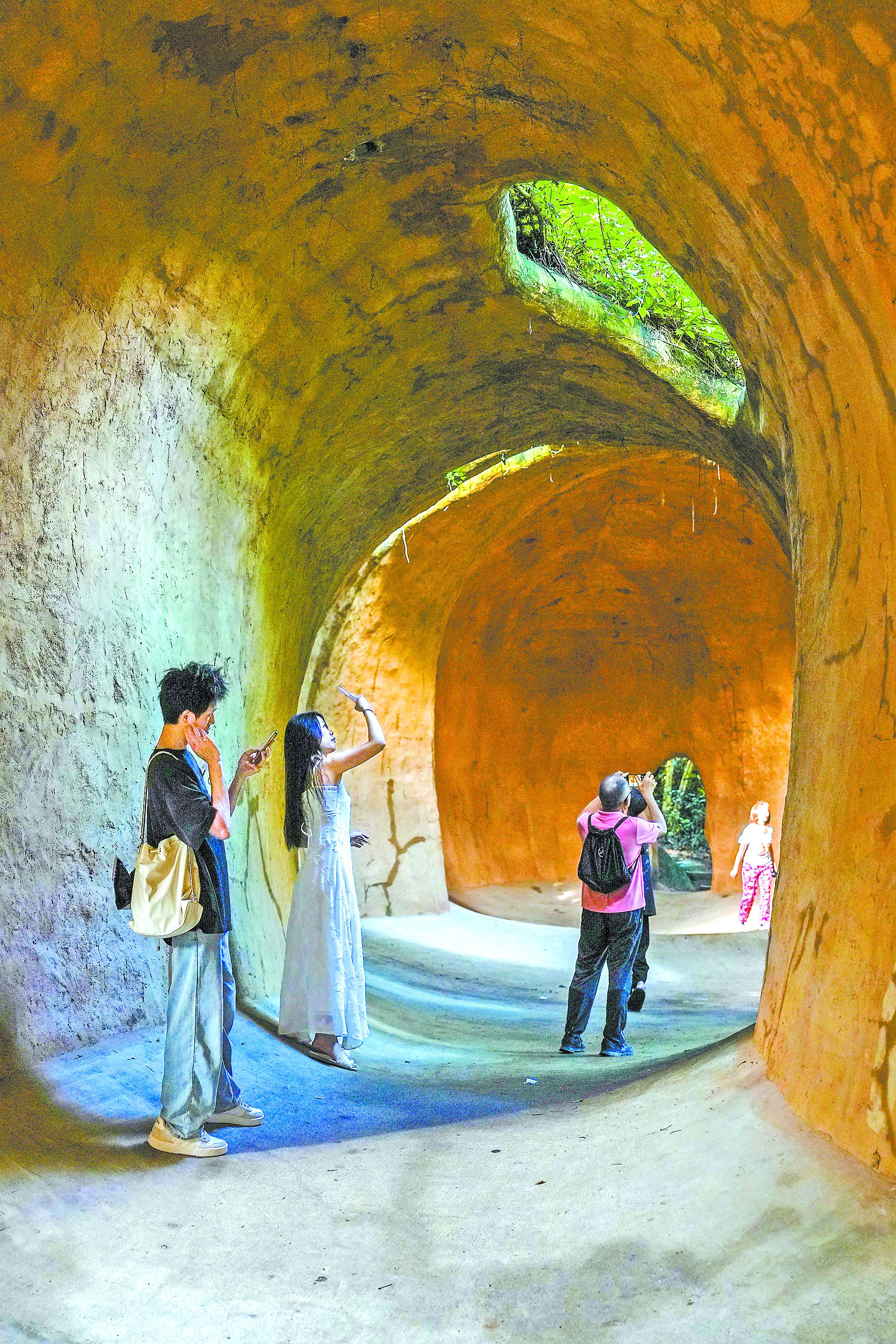 Visitors take selfies and photos inside the Earthworm Cave at the Shenzhen Soil and Water Conservation Park in Nanshan District.