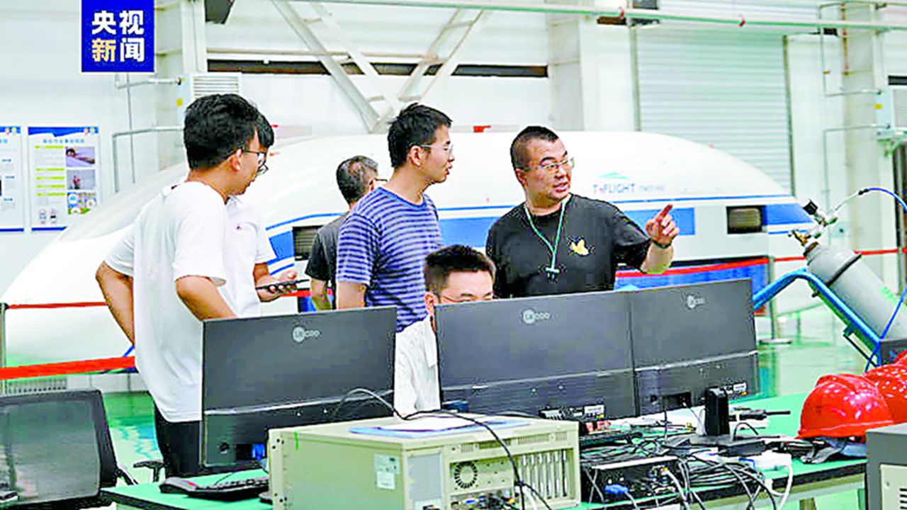 This still from a CCTV news report shows staffers during the test of an ultra-high-speed low-vacuum tube maglev transport system in Yanggao County, Shanxi Province recently. SD-Agencies