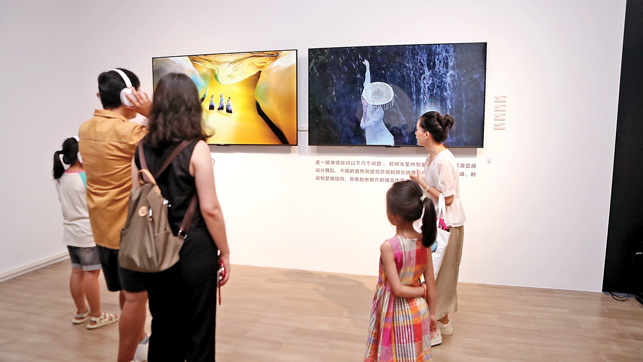 Visitors admire works at the Chinese dance video retrospective exhibition at Guangming Culture and Art Center.