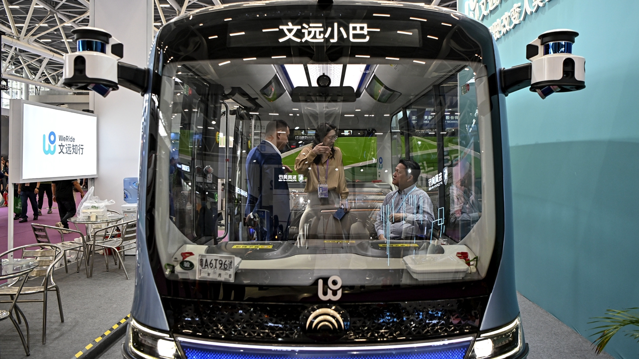 A staffer of the Guangzhou-based WeRide introduces a Robobus to a prospective client at the company’s booth at the 133rd Canton Fair in Guangzhou in this April 17 file photo. Xinhua