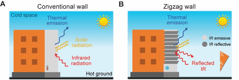 This zigzag wall design can cool off a building by reflecting both incoming solar radiation (yellow) and heat from the ground (red), while also emitting heat, as long-wave infrared radiation (blue), back to space. It provides a practical solution for cooling buildings in the current warming world, expediting the transition to a carbon-neutral society.