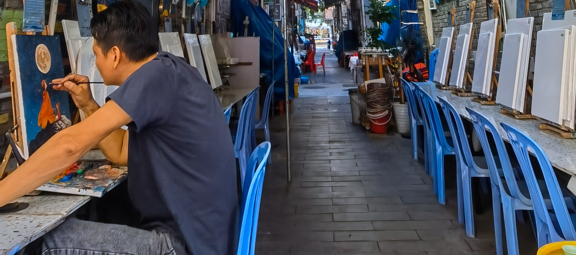 Located in Dafen Community, Buji Subdistrict, Longgang District, Dafen Oil Painting Village has attracted over 1,800 galleries and art organizations, and about 8,000 workers in the oil painting industry in the core area of only about 0.4 square kilometers. Moreover, totally there are about 20,000 workers in the business if the surrounding communities are included. Dafen is known as the "Leading Oil Painting Village in China", as well as being one of the first "National Demonstration Bases of Cultural Industry" in China, and the first one in Shenzhen. It is the forerunner as the ICIF branch, and moreover, it keeps the record of the most times of hosting ICIF (Shenzhen International Cultural Industry Fair) branches. In the future, Dafen will continue to adhere to the oil painting industry as the main foundation, and introduce art blocks, tourist towns, art hotels, creative designs and other forms of business, so as to build Dafen into a sales center of national oil painting industry and a well-known international art community.