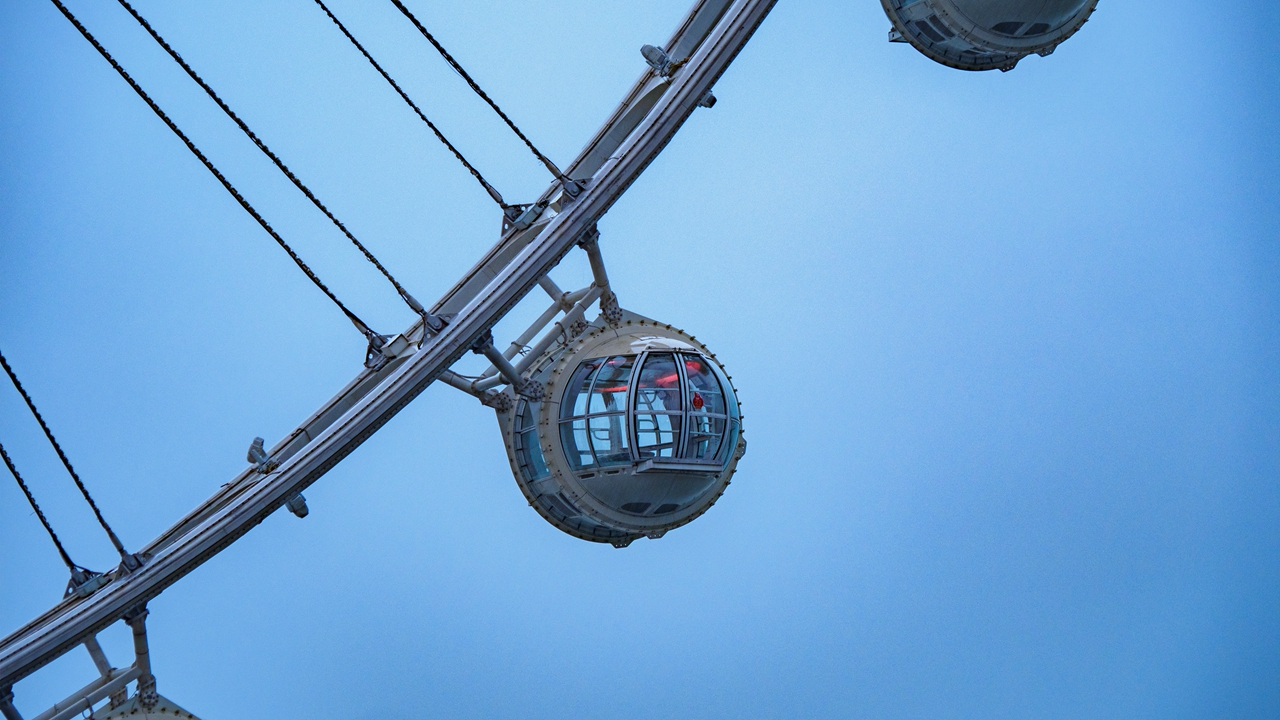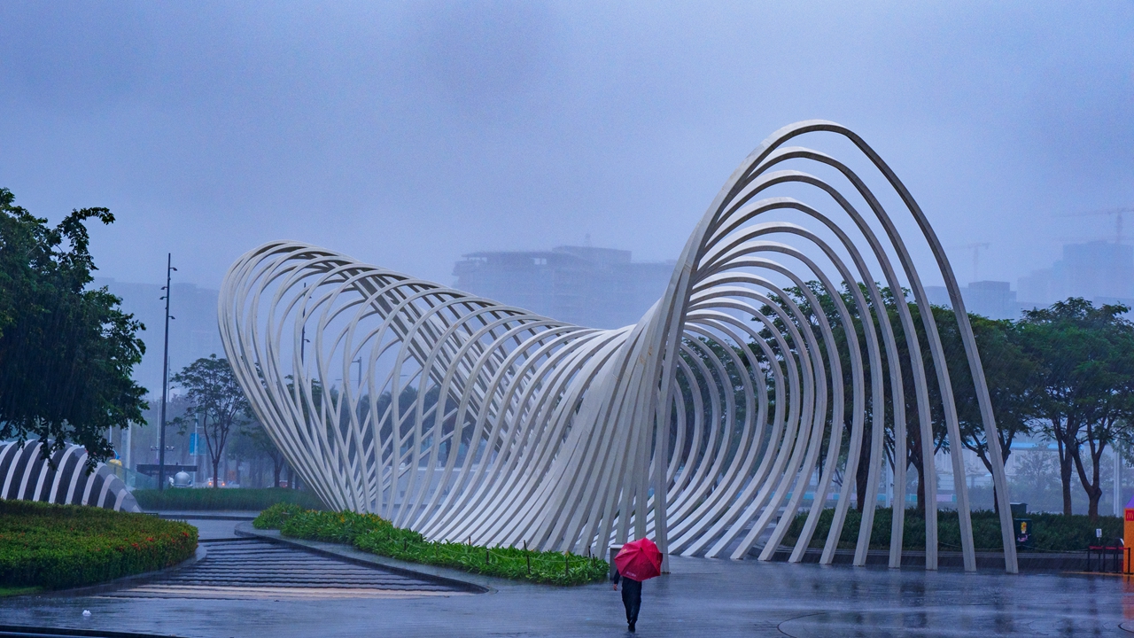 As you approach Bay Glory from the east, the first thing you see is the white spiral entrance. Due to local thunderstorms, the Ferris wheel had paused its service, but I still managed to get some photos close to the individual platform units. In the evening, I captured images of the commercial spaces, each floor decorated with neon trim, and the beautifully designed curving walking paths leading to the waterfront park.