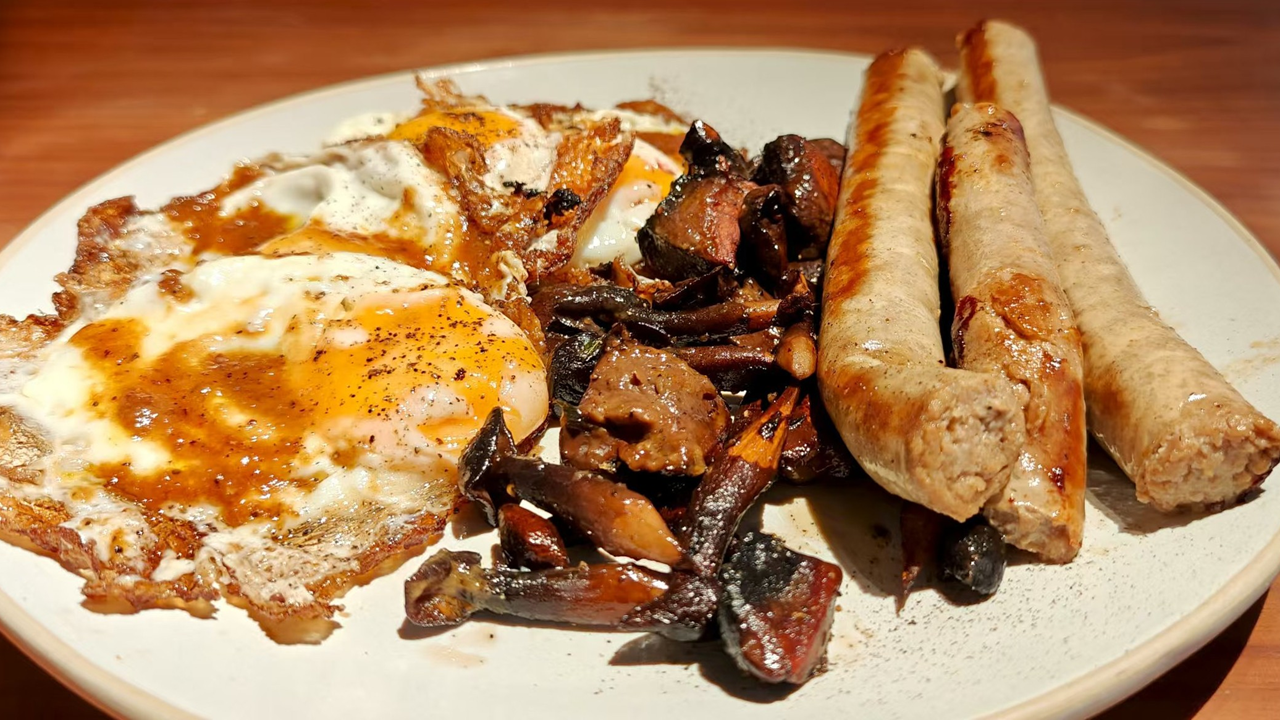 First to arrive was the Magpie Full Breakfast. The menu cheekily describes its components as “TWO EGGS, THREE SAUSAGES, ALL THE OTHER STUFF.” That “other stuff” turned out to be a glorious, heaping portion of wild mushrooms, sautéed into earthy, umami-rich submission. Alongside three perfectly cooked sausages and two crispy-edged fried eggs, it was a formidable plate of food. This was a breakfast that didn’t mess around. It was fuel for a day of exploring the surrounding art district — a hearty, honest-to-goodness feast that lived up to its no-nonsense billing.