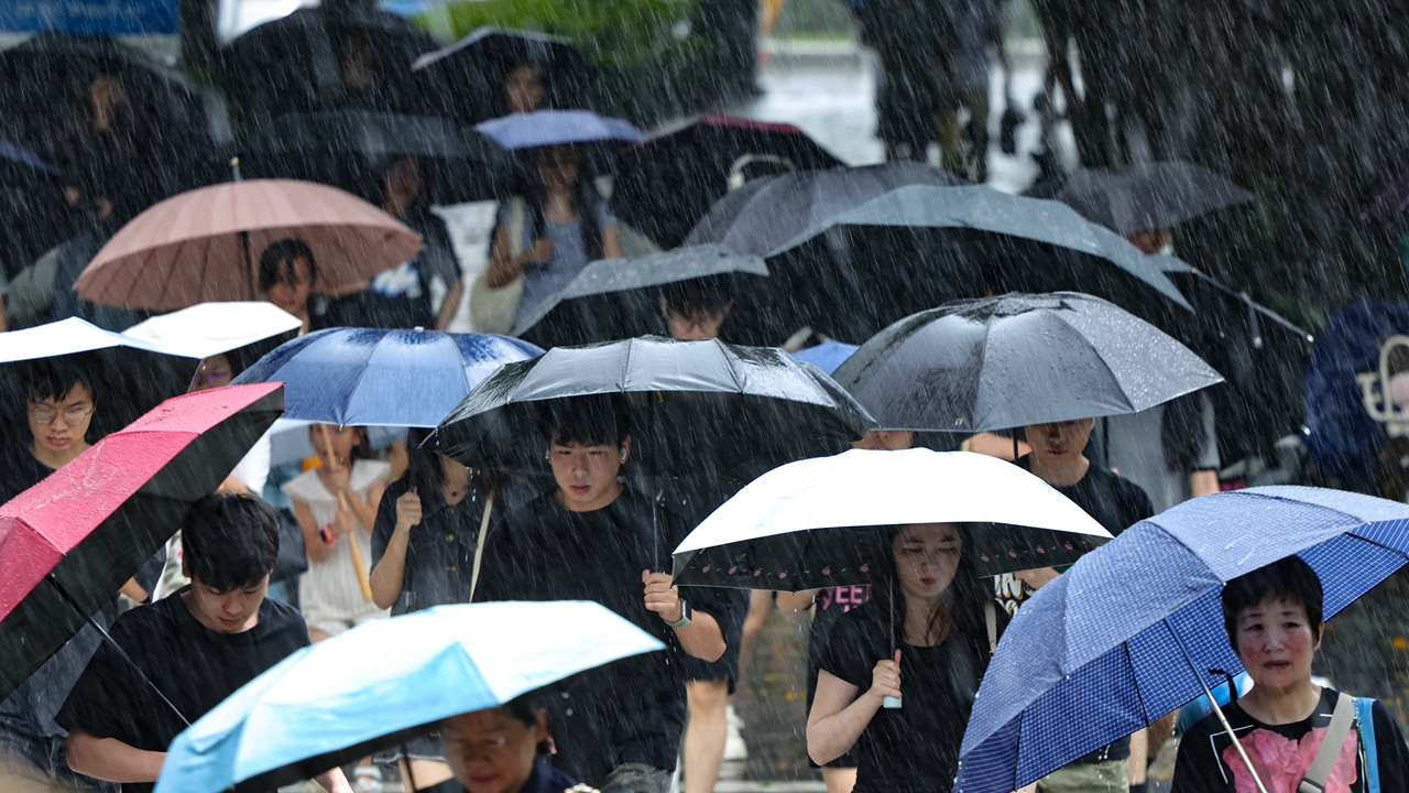 Citizens make their way through the downpour on the morning of Sept. 8. Liu Xudong