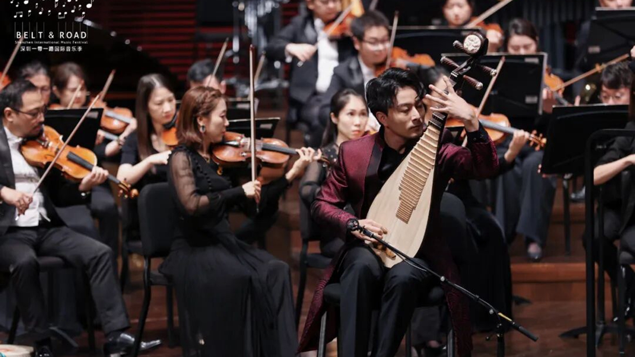 Chinese pipa soloist Li Luo delivers a solo with the Shenzhen Symphony Orchestra during the opening concert of the 2025 Shenzhen “Belt and Road” International Music Festival.