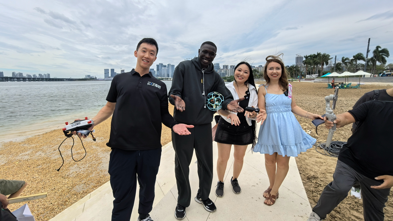 The next day Lame visited Qianhai. At Guiwan Park and Qianhai Stone Park, he experienced AI applications such as unmanned boats, drone soccer, and drone basketball. Vlogger Vilchinskaia presented him with cultural and creative gifts embodying Shenzhen’s character: a baseball cap emblazoned with “EyeShenzhen” and a Shenzhen Metro cultural IP mascot, “Tie Bao.”