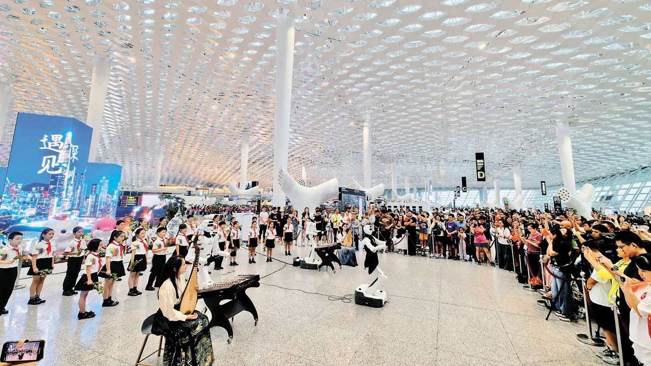A humanoid robot band joins the Flying Rainbow Ethnic Children’s Choir and a pipa soloist to perform the classic folk song “Jasmine Flower” for travelers at the Shenzhen Bao’an International Airport on Sunday. Xie Qizong