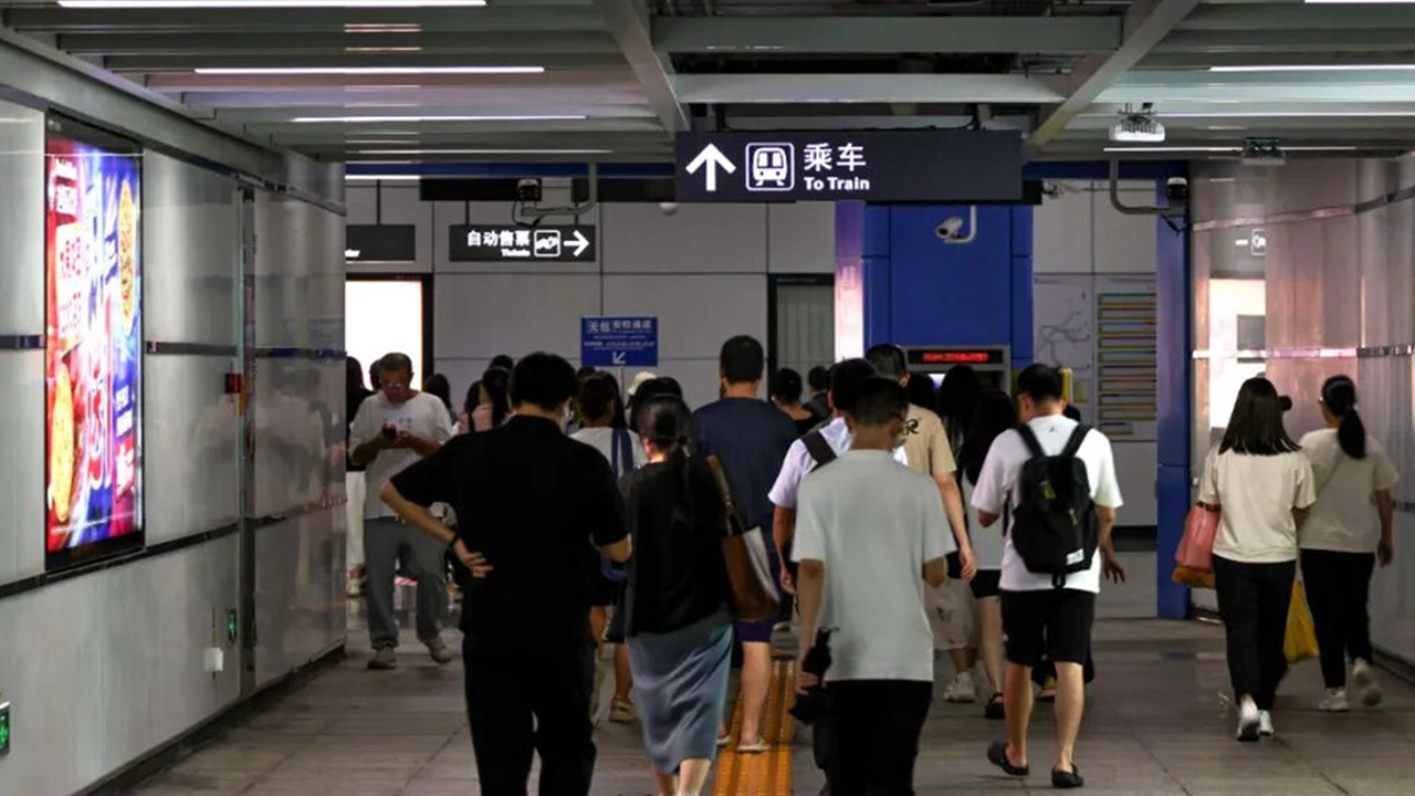 Passangers walk into a Metro station in Futian as public transport begins phased suspension ahead of Typhoon Ragasa this afternoon.