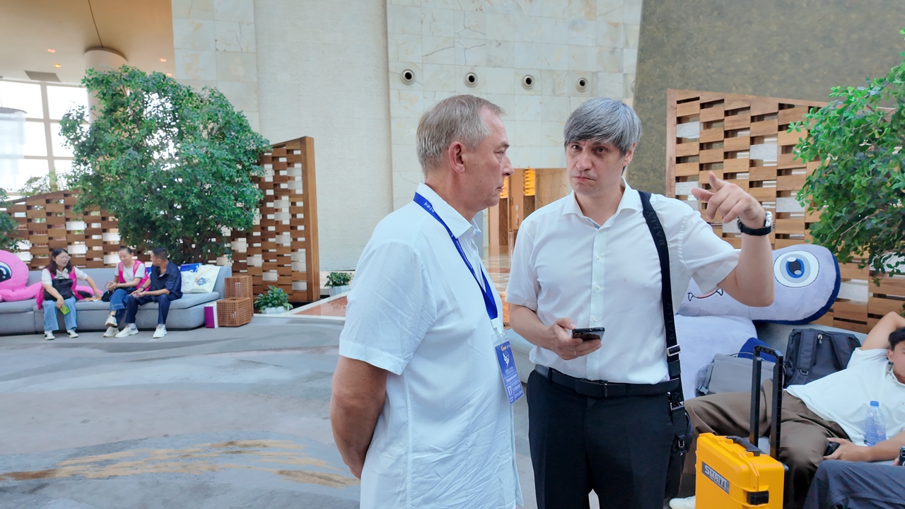 Denis Ananev (R) from Russia exchanges views with a group member at the InterContinental Shenzhen Dameisha Resort in Yantian District on Thursday.