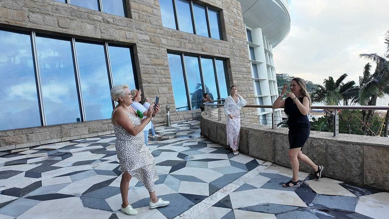 Tourists capture blue skies and coastal views outside the resort as weather conditions clear following Typhoon Ragasa on Thursday.