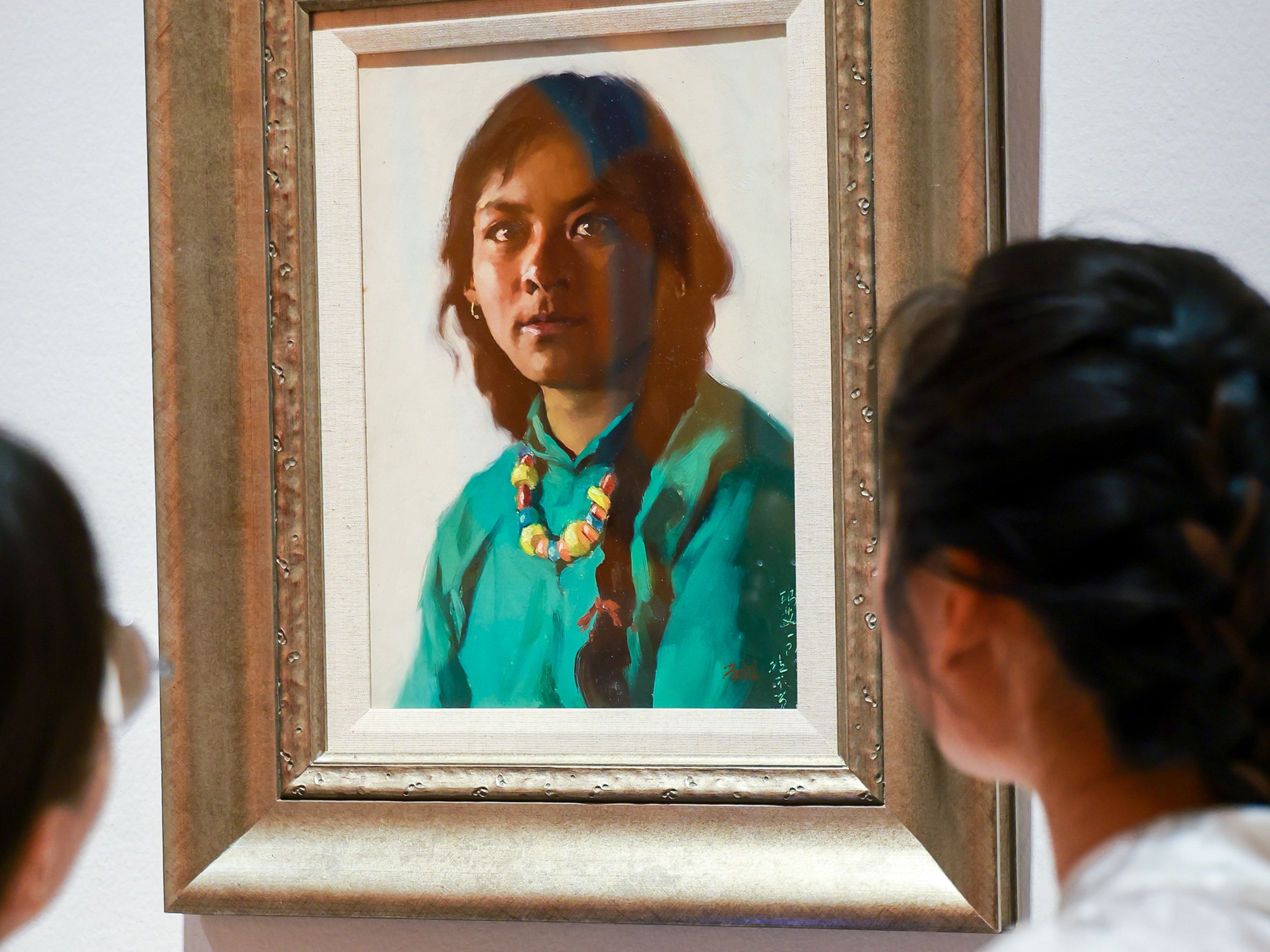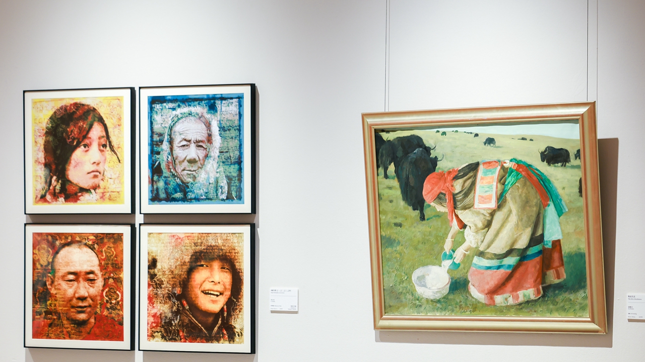 The exhibition features 120 works — traditional Chinese paintings, oil paintings, prints, and watercolors — drawn from the collections of the Guan Shanyue Art Museum and the Xizang Art Museum, alongside newly created pieces.