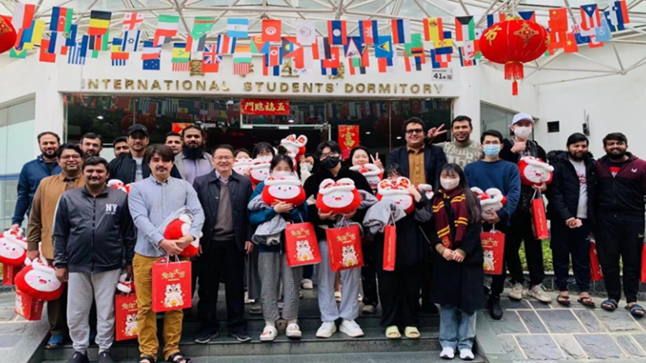 Amir Hamza and other international students celebrate Chinese New Year and receive gifts from university management during an event at Shenzhen University.